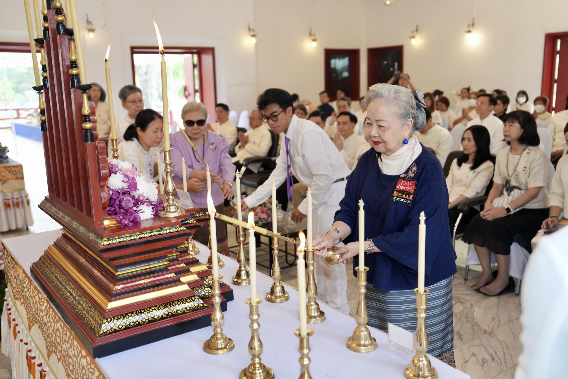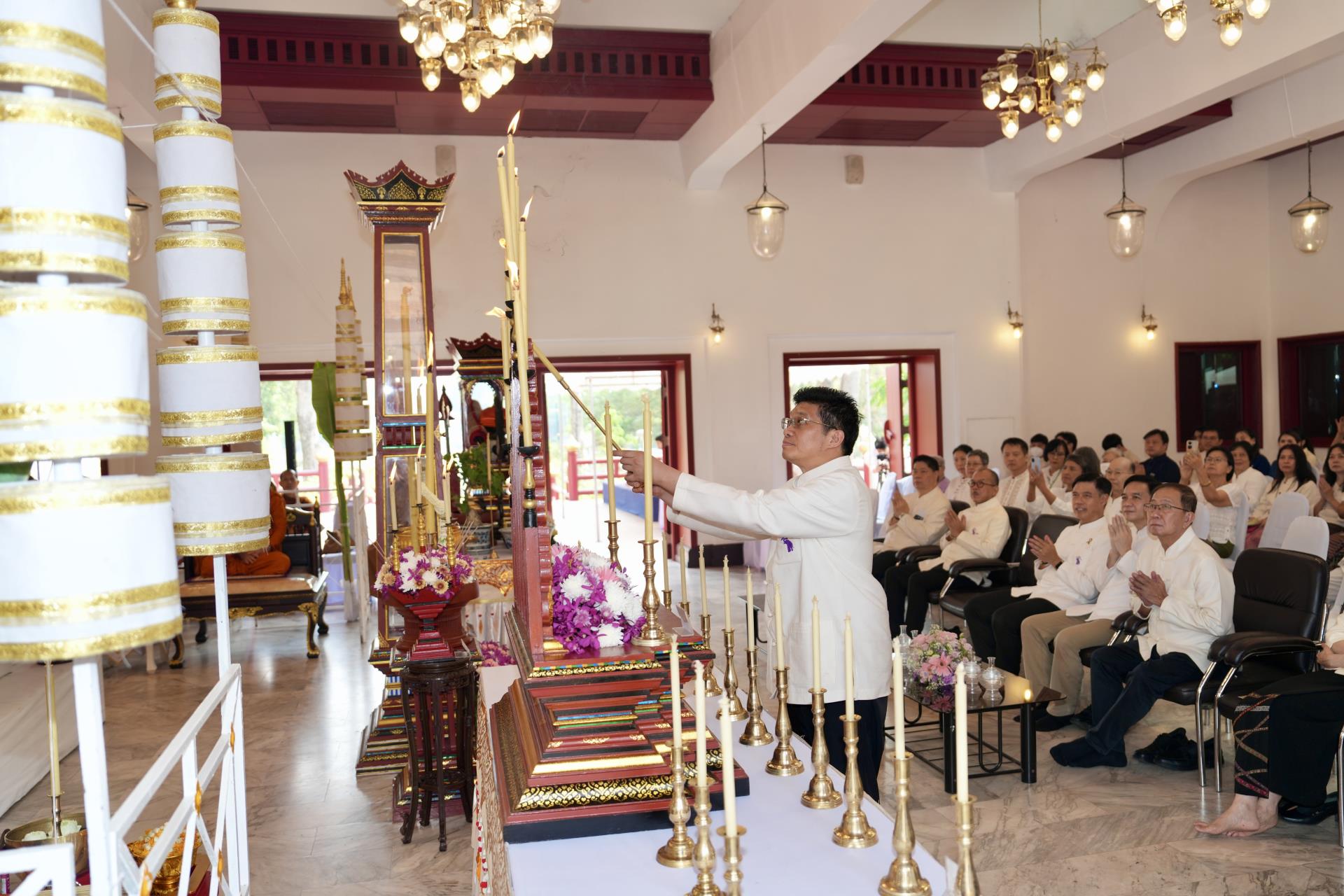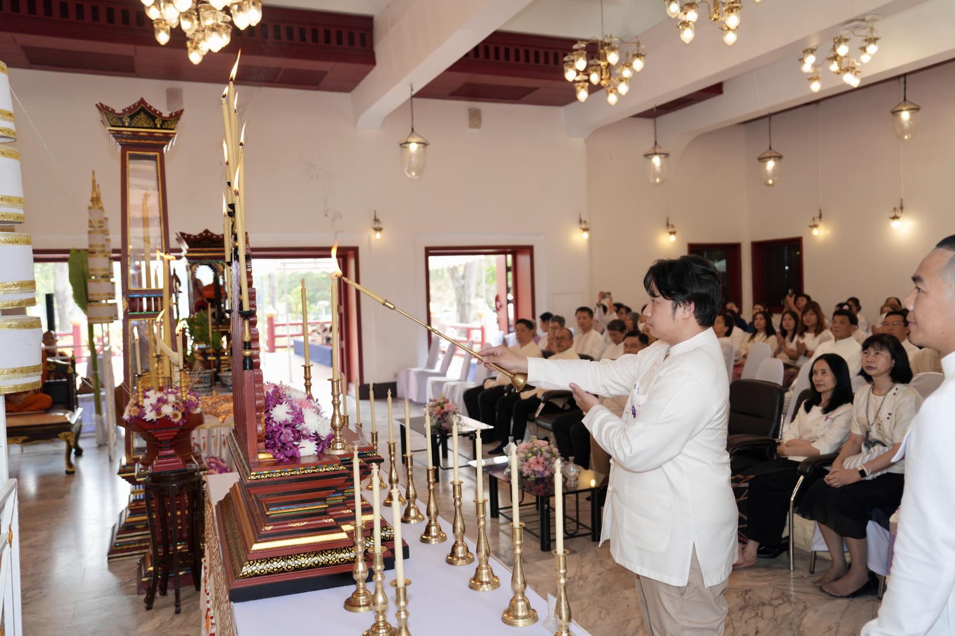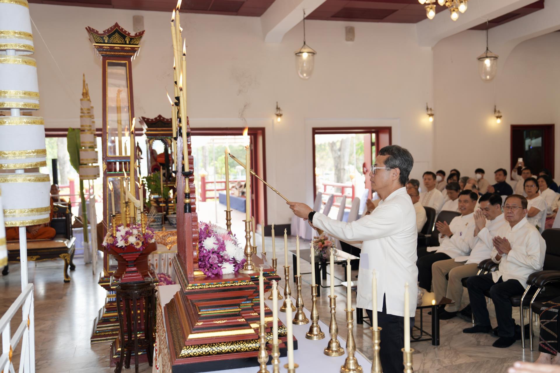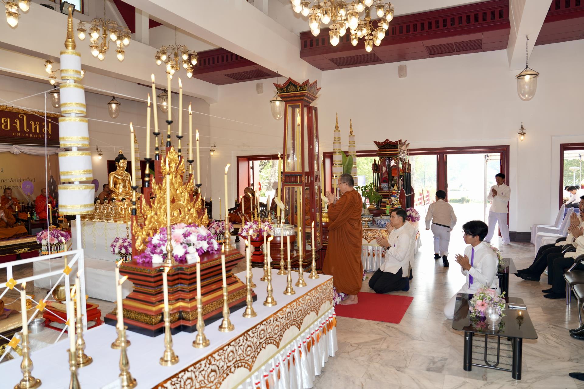 สำนักงานมหาวิทยาลัย ร่วมกับ มหาวิทยาลัยเชียงใหม่ จัดพิธีพุทธาภิเษก “พระพุทธเมตตาสิกขาชน” พระพุทธปฏิมาประจำสำนักงานมหาวิทยาลัย และพิธีทำบุญสำนักงานมหาวิทยาลัย โดยได้รับความเมตตาจาก พระครูสังวรญาณโสภณ (เจริญ ญาณวุฑฺโฒ) เจ้าอาวาสวัดถ้ำปากเปียง อ.เชียงดาว จ.เชียงใหม่ เป็นประธานสงฆ์ และมี ศาสตราจารย์ ดร.นพ.พงษ์รักษ์ ศรีบัณฑิตมงคล อธิการบดีมหาวิทยาลัยเชียงใหม่ เป็นประธานฝ่ายฆราวาสในพิธี เนื่องในประเพณีปี๋ใหม่เมือง ประจำปี 2569 โดยมีคณะผู้บริหาร ผู้อำนวยการและเจ้าหน้าที่ บุคลากร ของสำนักงานมหาวิทยาลัย เข้าร่วมพิธีฯ ณ ศาลาธรรม มหาวิทยาลัยเชียงใหม่ เมื่อวันศุกร์ที่ 24 เมษายน พ.ศ. 2569
