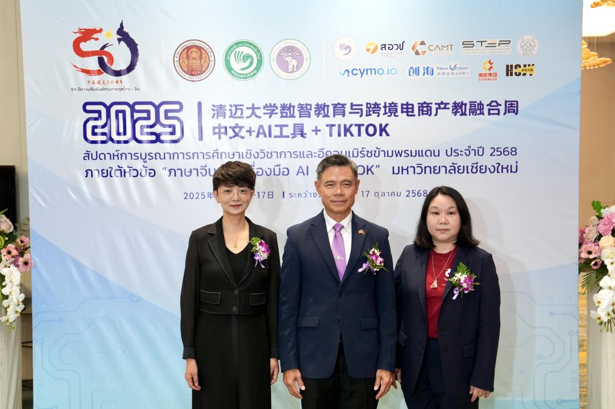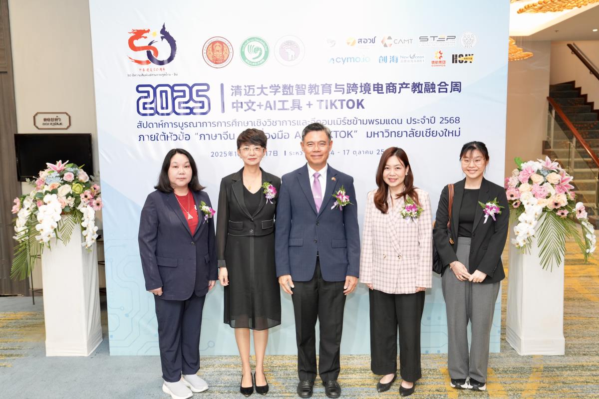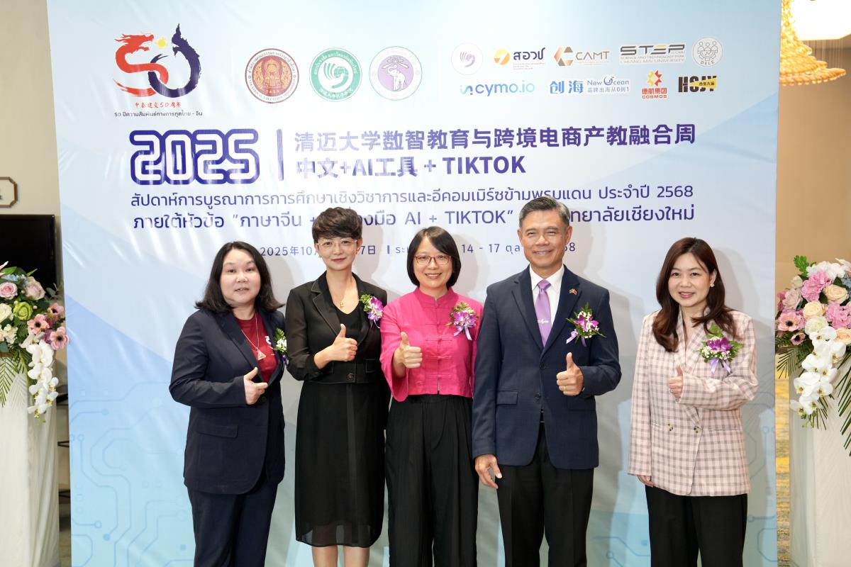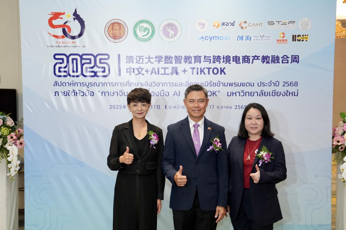 สถาบันขงจื่อ มหาวิทยาลัยเชียงใหม่ ร่วมกับสำนักงานคณะกรรมการการอาชีวศึกษา และวิทยาลัย ศิลปะ สื่อและเทคโนโลยี จัดโครงการ “สัปดาห์การบูรณาการการศึกษาเชิงวิชาการและอีคอมเมิร์ซข้ามพรมแดน” ภายใต้หัวข้อ “ภาษาจีน + เครื่องมือ AI + TikTok” ระหว่างวันที่ 14-17 ตุลาคม 2568 เพื่อพัฒนาทักษะด้านอีคอมเมิร์ซข้ามพรมแดนในยุคดิจิทัล โดยผู้เข้าร่วมโครงการจะได้เรียนรู้และฝึกฝนการใช้เครื่องมือ AI และทักษะการบริหารจัดการแพลตฟอร์ม TikTok เพื่อสร้างสรรค์เนื้อหาสำหรับโปรโมตสินค้าท้องถิ่นและแหล่งท่องเที่ยวอันเป็นเอกลักษณ์ของไทยและเพื่อเฉลิมฉลองครบรอบ 50 ปีความสัมพันธ์ไทย-จีนอย่างสร้างสรรค์ โดยได้รับเกียรติจาก ศาสตราจารย์ดร. นายแพทย์พงษ์รักษ์ ศรีบัณฑิตมงคล อธิการบดีมหาวิทยาลัยเชียงใหม่ ประธานเปิดโครงการ พร้อมด้วย Ms. Lian Chen ผู้อำนวยการฝ่ายจีน สถาบันขงจื่อ มหาวิทยาลัยเชียงใหม่ ณ โรงแรมอโมร่า ท่าแพ จังหวัดเชียงใหม่ เมื่อวันอังคาร ที่14 ตุลาคม 2568