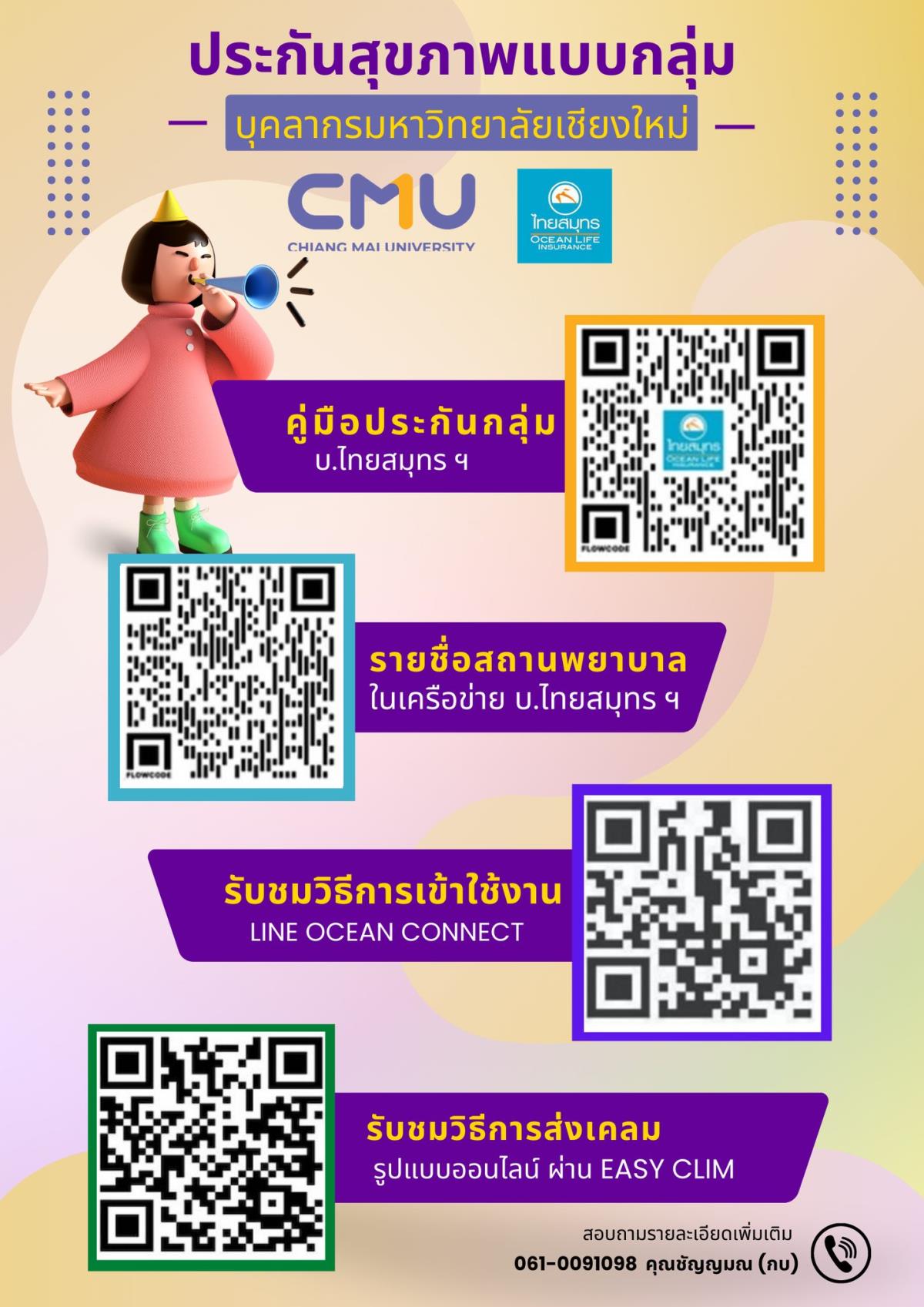 ด้วยมหาวิทยาลัยเชียงใหม่ ได้ดำเนินการจัดทำประกันสุขภาพแบบกลุ่มสำหรับบุคลากรและครอบครัวของบุคลากร บัดนี้ ได้ลงนามสัญญากรมธรรม์กับบริษัท ไทยสมุทรประกันชีวิต จำกัด (มหาชน) เรียบร้อยแล้ว จึงขอแจ้งให้ทุกส่วนงานได้รับทราบความคุ้มครองประกันสุขภาพ