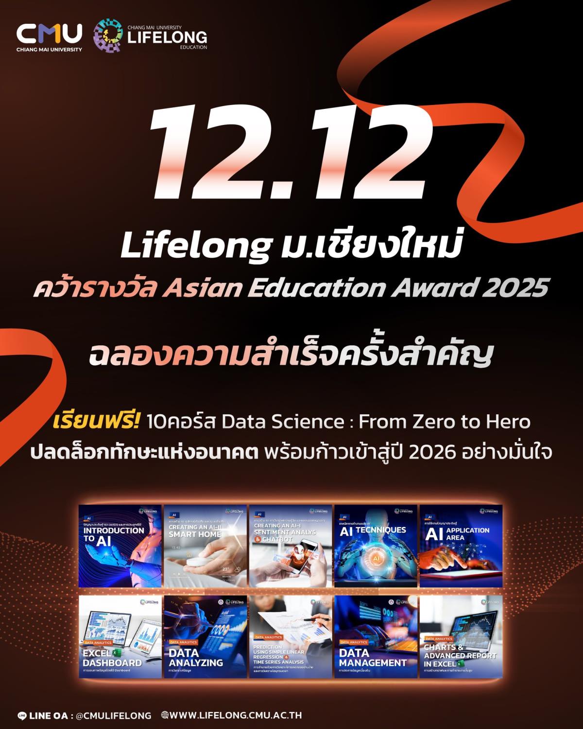 ในวาระแห่งความสำเร็จนี้ วิทยาลัยการศึกษาตลอดชีวิต มช. มอบของขวัญการเรียนรู้ผ่านแคมเปญ 12.12 เปิดให้เรียนฟรี 10 คอร์ส “Data Science: From Zero to Hero” สามารถลงทะเบียนผ่านhttps://bit.ly/DataScience12_12 (เรียนฟรี 1 เดือน นับจากวันที่สมัคร) เพื่อสนับสนุนการยกระดับทักษะแห่งอนาคตของคนไทยทุกคน พร้อมเปิดโอกาสเข้าสู่โลกดิจิทัลอย่างมั่นใจในปี 2026 มหาวิทยาลัยเชียงใหม่ขอขอบคุณทุกภาคส่วนที่ร่วมสนับสนุน และจะยังคงเดินหน้าสร้างสังคมแห่งการเรียนรู้ตลอดชีวิตให้เติบโตอย่างแข็งแรงและยั่งยืนต่อไป