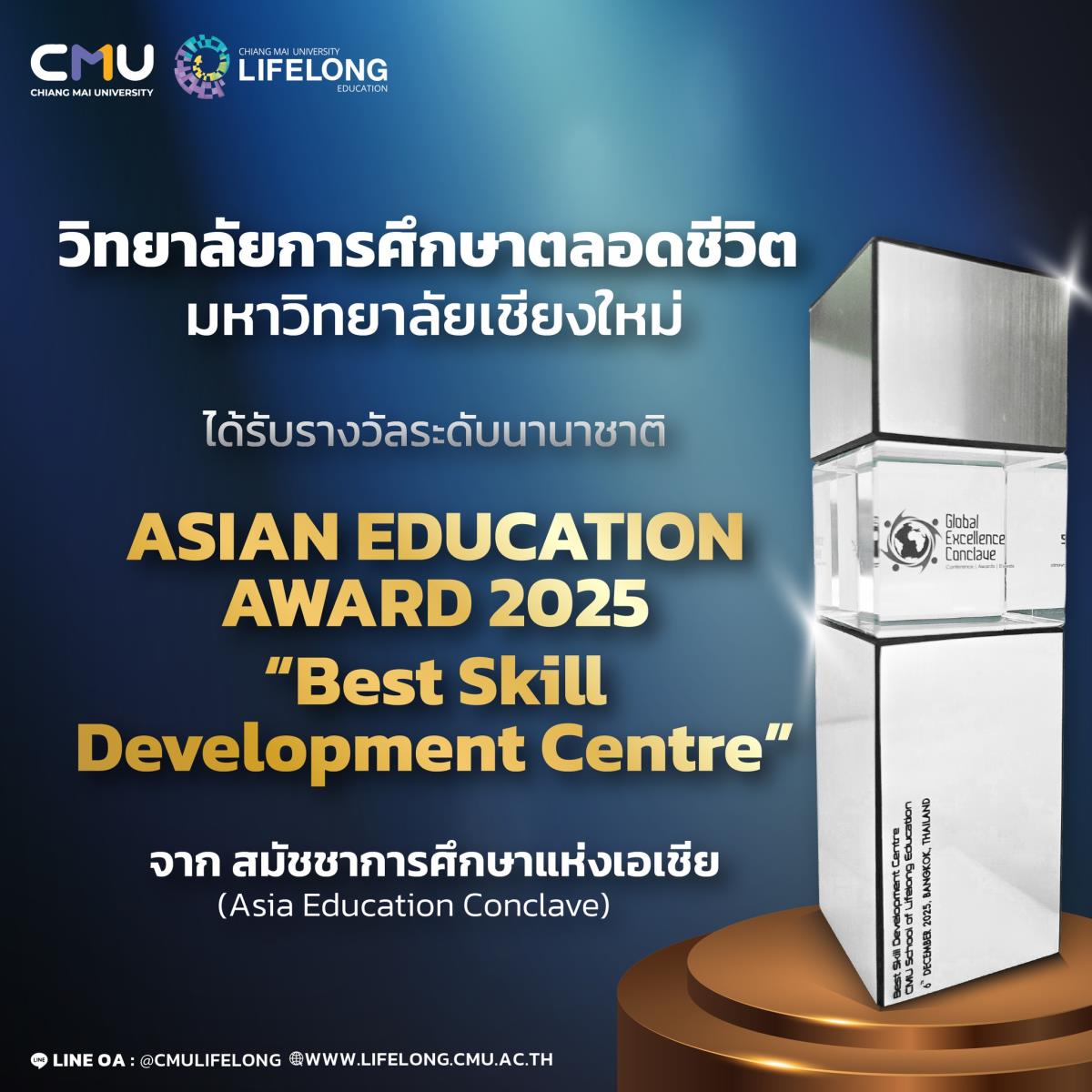 มหาวิทยาลัยเชียงใหม่ โดยวิทยาลัยการศึกษาตลอดชีวิต (CMU School of Lifelong Education) สร้างความภาคภูมิใจครั้งใหม่ให้วงการการศึกษาไทย คว้า 2 รางวัลสำคัญจากเวทีระดับนานาชาติ Asian Education Award 2025 ซึ่งจัดโดย สมัชชาการศึกษาแห่งเอเชีย Asia Education Conclave (AEC) ณ โรงแรมอมารี กรุงเทพฯ เมื่อวันที่ 6 ธันวาคม 2568 ที่ผ่านมา สะท้อนความมุ่งมั่นที่จะยกระดับคุณภาพการศึกษาและขับเคลื่อนการเรียนรู้ตลอดชีวิตในยุคที่การพัฒนาทักษะเป็นหัวใจสำคัญของการเติบโตทางเศรษฐกิจและสังคมของภูมิภาคเอเชีย