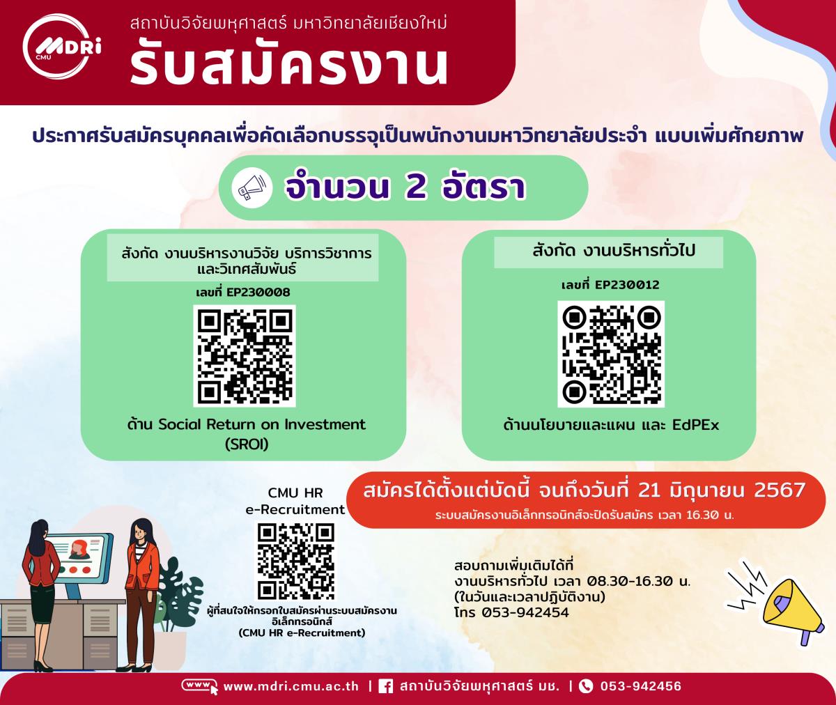 1. รับสมัครบุคคลเพื่อคัดเลือกบรรจุเป็นพนักงานมหาวิทยาลัย ตำแหน่ง นักจัดการงานทั่วไป งานบริหารงานวิจัย บริการวิชาการและวิเทศสัมพันธ์ ด้าน Social Return on Investment (SROI) จำนวน 1 อัตรา ตำแหน่งเลขที่ EP230008