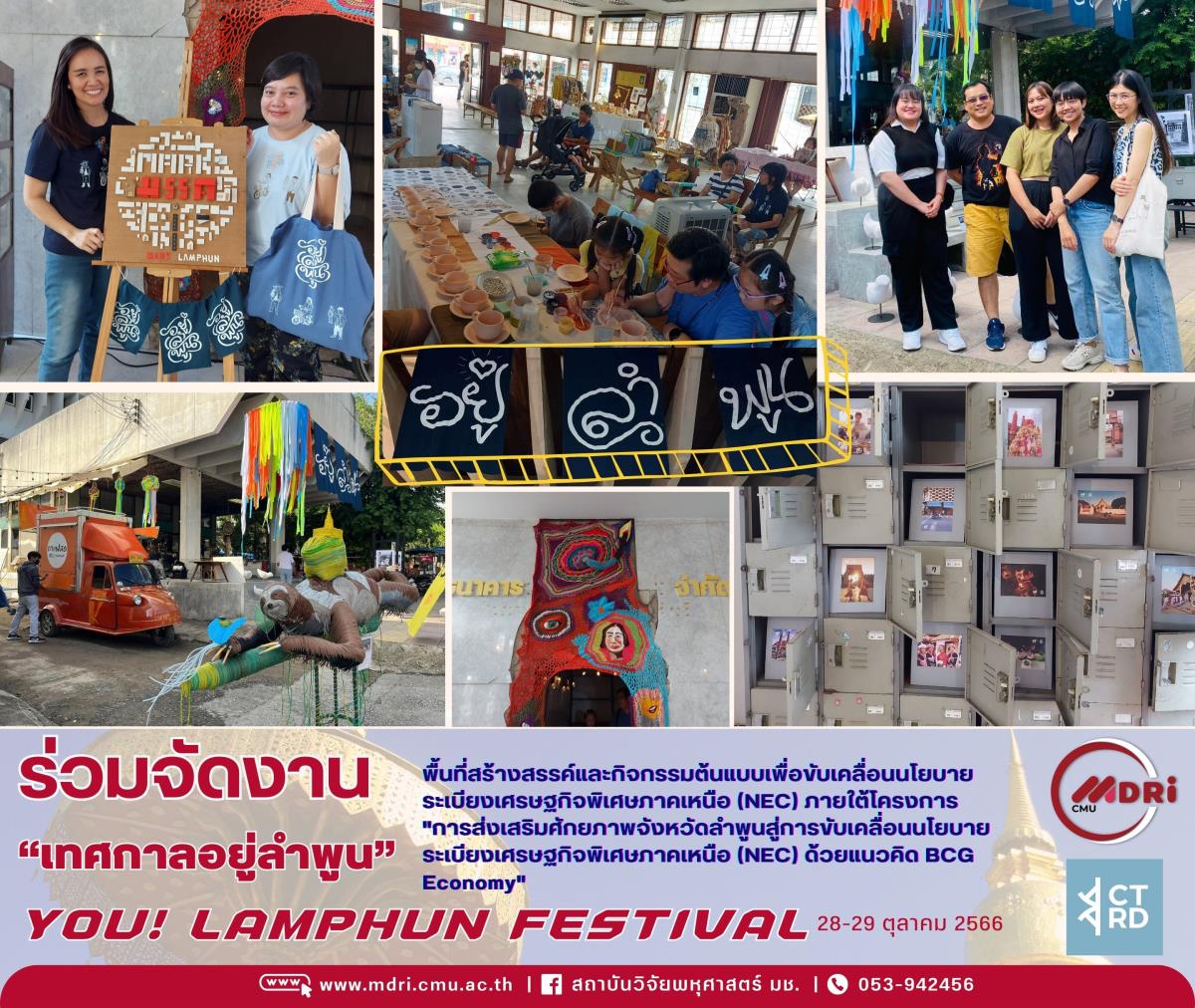 ศูนย์วิจัยและพัฒนาการท่องเที่ยว (CTRD) สถาบันวิจัยพหุศาสตร์ โดย ดร.ศันสนีย์ กระจ่างโฉม ดร.เผชิญวาส ศรีชัย และ ดร.รชพรรณ ฆารพันธ์ ร่วมจัดงาน “เทศกาลอยู่ลำพูน” YOU! LAMPHUN FESTIVAL พื้นที่สร้างสรรค์และกิจกรรมต้นแบบเพื่อขับเคลื่อนนโยบายระเบียงเศรษฐกิจพิเศษภาคเหนือ (NEC) ภายใต้โครงการ "การส่งเสริมศักยภาพจังหวัดลำพูนสู่การขับเคลื่อนนโยบายระเบียงเศรษฐกิจพิเศษภาคเหนือ (NEC) ด้วยแนวคิด BCG Economy" เมื่อวันที่ 28-29 ตุลาคม พ.ศ. 2566 ณ อาคารธนาคารนครหลวงไทย อำเภอเมือง จังหวัดลำพูน