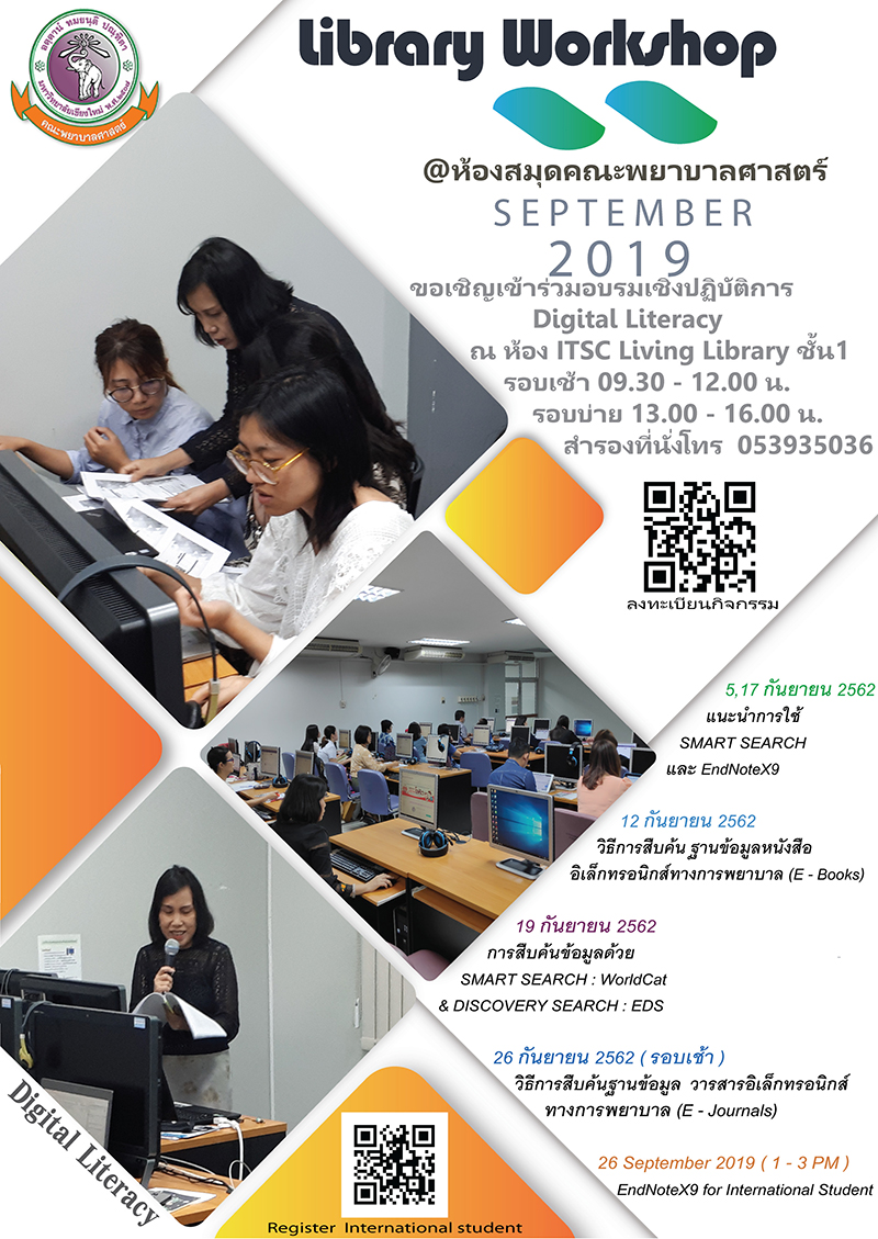 ห้องสมุดคณะพยาบาลศาสตร์ขอเชิญเข้าร่วมกิจกรรมอบรมเชิงปฏิบัติการ Digital Literacy ประจำเดือนกันยายน 2562