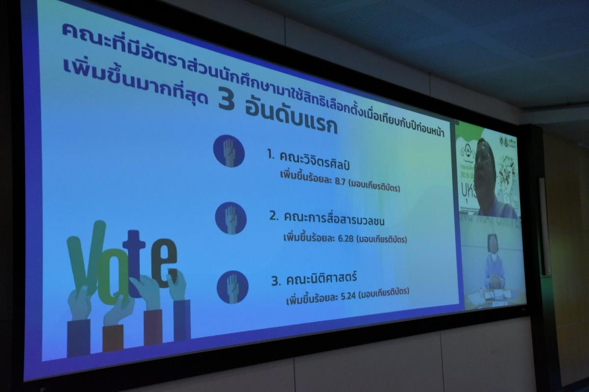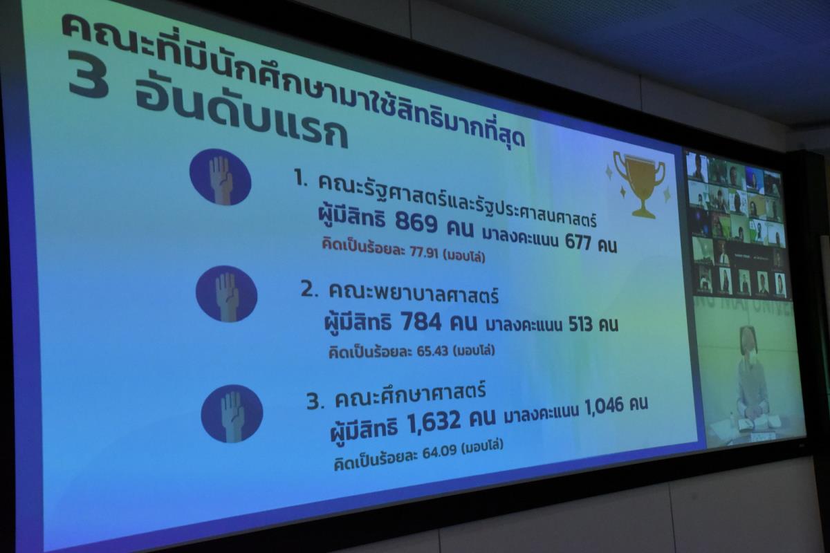 ศาสตราจารย์คลินิก นพ.นิเวศน์ นันทจิต อธิการบดีมหาวิทยาลัยเชียงใหม่ เป็นประธานมอบโล่ประกาศเกียรติคุณให้แก่คณะที่มีนักศึกษาไปใช้สิทธิ์ลงคะแนนเสียงเลือกตั้งผู้นำนักศึกษามหาวิทยาลัยเชียงใหม่ ประจำปีการศึกษา 2565 ได้แก่ อันดับที่ 1 คณะรัฐศาสตร์และรัฐประศาสนศาสตร์ (ร้อยละ 77.91) อันดับที่ 2 คณะพยาบาลศาสตร์ (ร้อยละ 65.43) และอันดับที่ 3 คณะศึกษาศาสตร์ (ร้อยละ 64.09) และมอบใบประกาศนียบัตรแก่คณะที่สามารถสร้างอัตราส่วนให้นักศึกษามาใช้สิทธิ์ลงคะแนนเสียงเลือกตั้งเพิ่มขึ้นเมื่อเทียบกับสถิติในปีก่อน ได้แก่ อันดับที่ 1 คณะวิจิตรศิลป์ (ร้อยละ 8.7) อันดับที่ 2 คณะการสื่อสารมวลชน (ร้อยละ 6.28) และอันดับที่ 3 คณะนิติศาสตร์ (ร้อยละ 5.24) โดยมีคณะผู้บริหาร คณาจารย์ เจ้าหน้าที่ ร่วมแสดงความยินดี ในการประชุมคณะกรรมการบริหารมหาวิทยาลัยเชียงใหม่ครั้งที่ 6/2565 ณ ห้องประชุม หม่อมหลวงปิ่น มาลากุล อาคารยุทธศาสตร์ สำนักงานมหาวิทยาลัย มหาวิทยาลัยเชียงใหม่ วันอังคารที่ 5 เมษายน พ.ศ. 2565