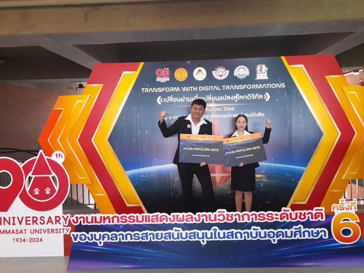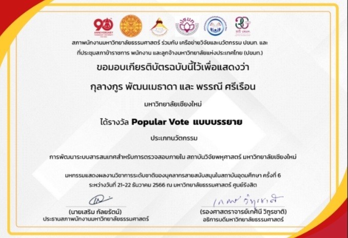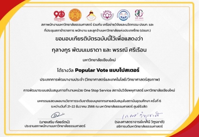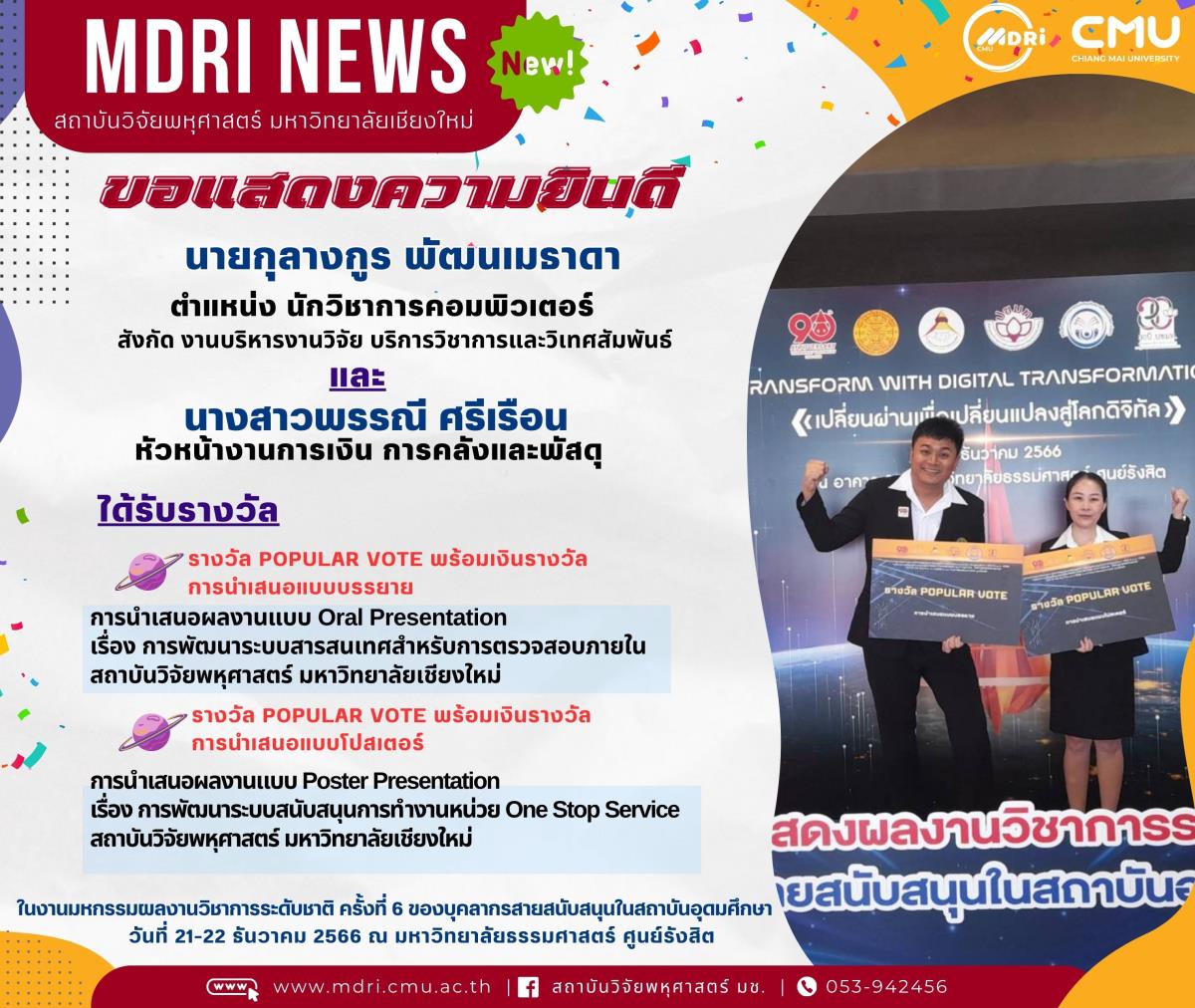 นายกุลางกูร พัฒนเมธาดา ตำแหน่ง นักวิชาการคอมพิวเตอร์ สังกัด งานบริหารงานวิจัย บริการวิชาการและวิเทศสัมพันธ์ และนางสาวพรรณี ศรีเรือน หัวหน้างานการเงิน การคลังและพัสดุ สถาบันวิจัยพหุศาสตร์ เข้าร่วมงานมหกรรมแสดงผลงานวิชาการระดับชาติของบุคลากรสายสนับสนุนในสถาบันอุดมศึกษา ครั้งที่ 6 ประจำปี พ.ศ. 2566 ภายใต้หัวข้อ “เปลี่ยนผ่านเพื่อเปลี่ยนแปลงสู่โลกดิจิทัล (Transform with Digital Transformations)” ซึ่งได้ส่งผลงานการนำเสนอแบบ Poster Presention และผลงานการนำเสนอแบบบรรยายเข้าร่วมประกวดในนามของสถาบันวิจัยพหุศาสตร์ มหาวิทยาลัยเชียงใหม่ จำนวน 2 เรื่อง โดยได้รับรางวัล ทั้ง 2 ประเภท ดังนี้.-