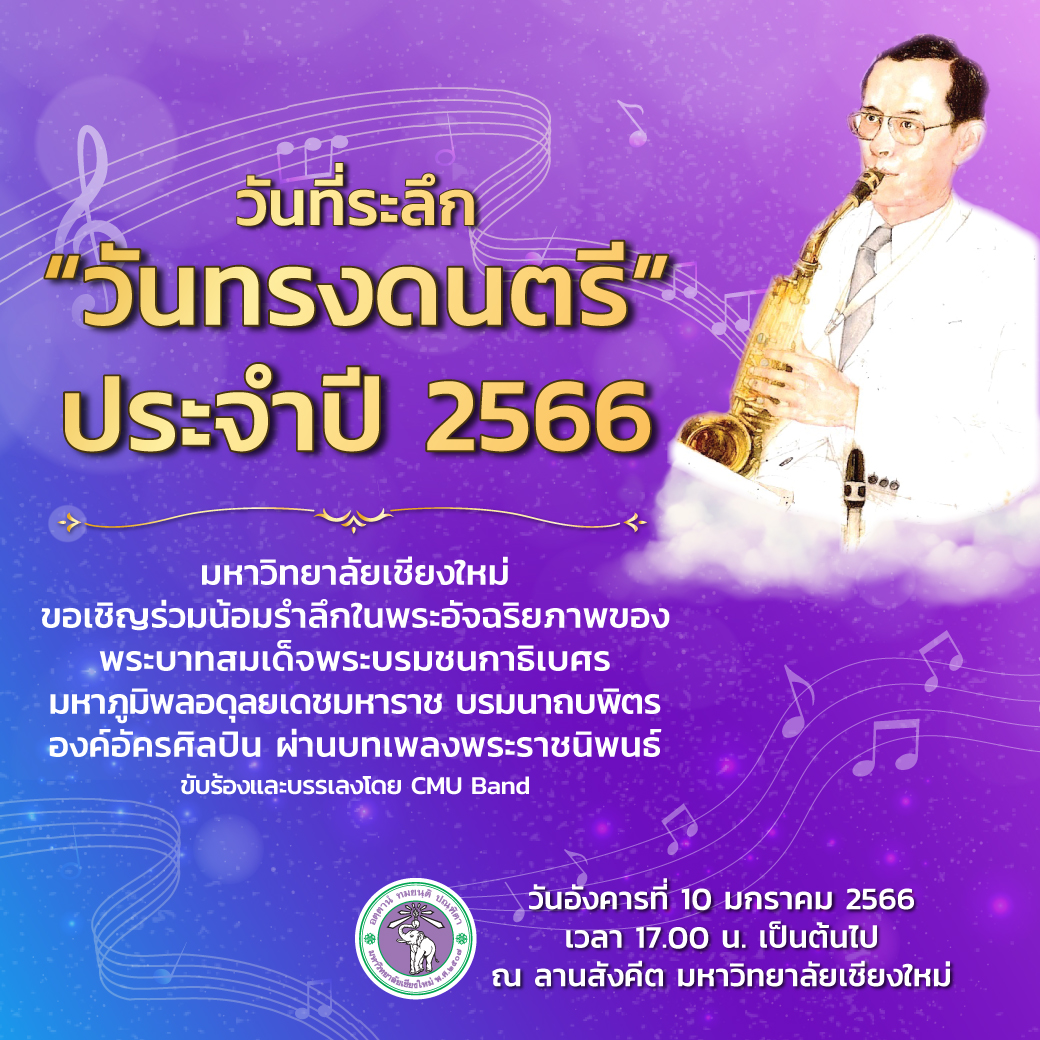 มหาวิทยาลัยเชียงใหม่ ขอเชิญร่วมน้อมรำลึกในพระอัจฉริยภาพของพระบาทสมเด็จพระบรมชนกาธิเบศร มหาภูมิพลอดุลยเดชมหาราช บรมนาถบพิตร องค์อัครศิลปิน ผ่านบทเพลงพระราชนิพนธ์ ในวันที่ระลึก “วันทรงดนตรี” วันอังคารที่ 10 มกราคม 2566 เวลา 17.00 – 20.00 น. ณ ลานสังคีต มช. ขับร้องและบรรเลงโดย CMU Band