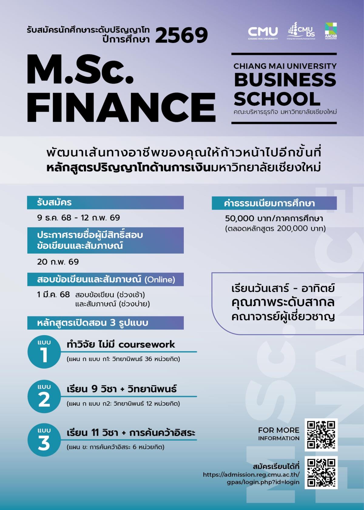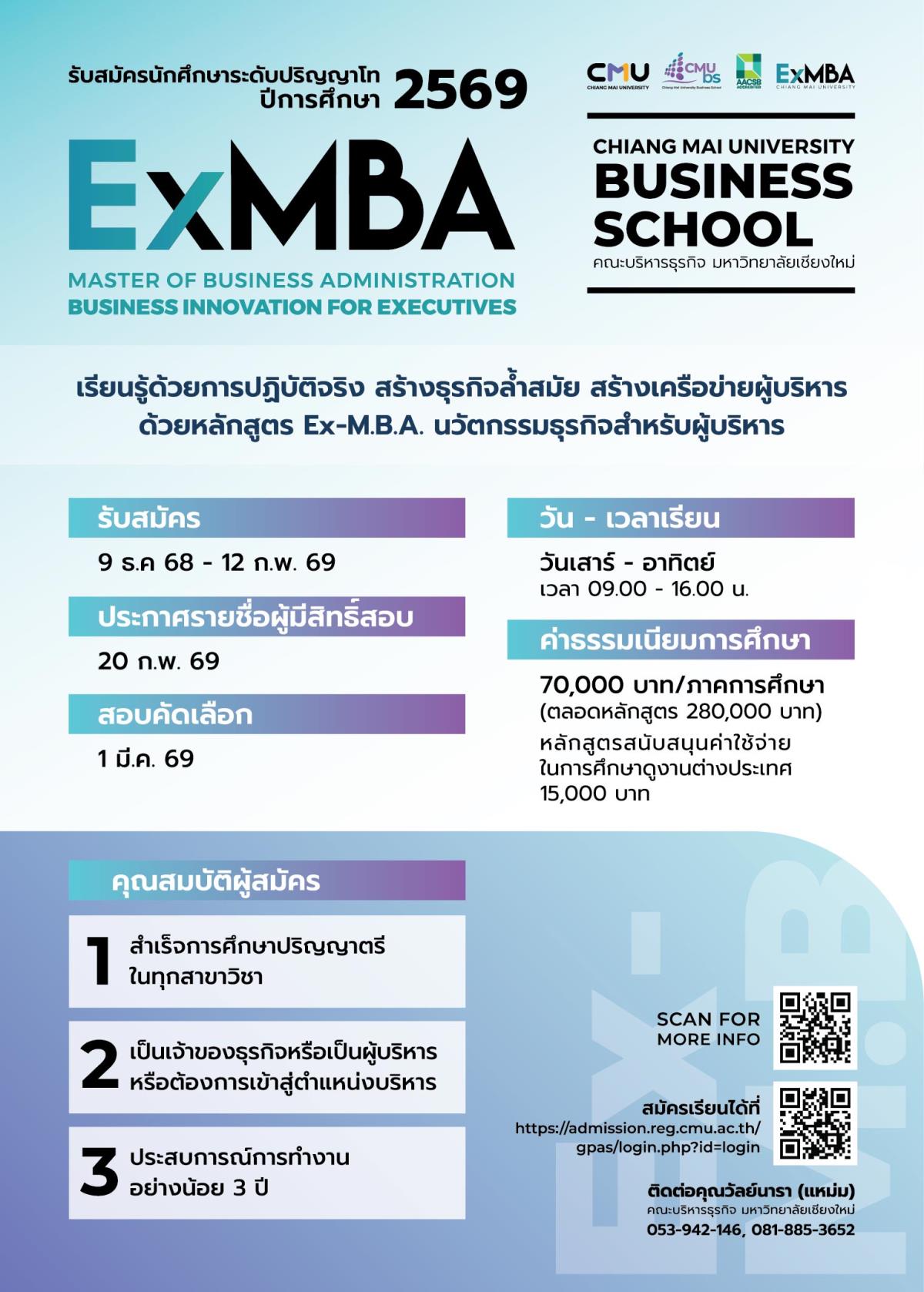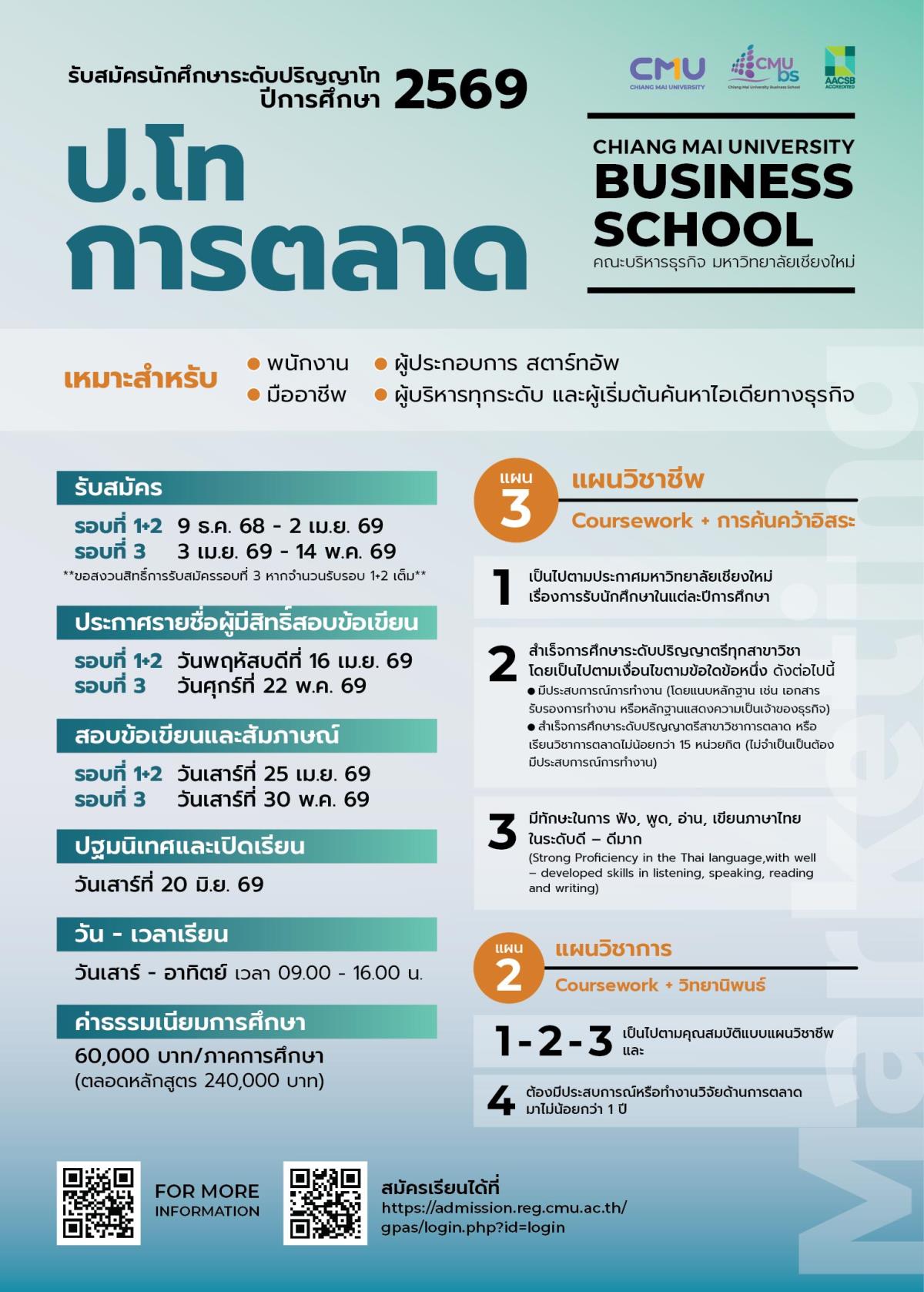 ผู้สนใจสามารถติดตามรายละเอียดได้ที่ https://www.cmubs.cmu.ac.th/admission/master/