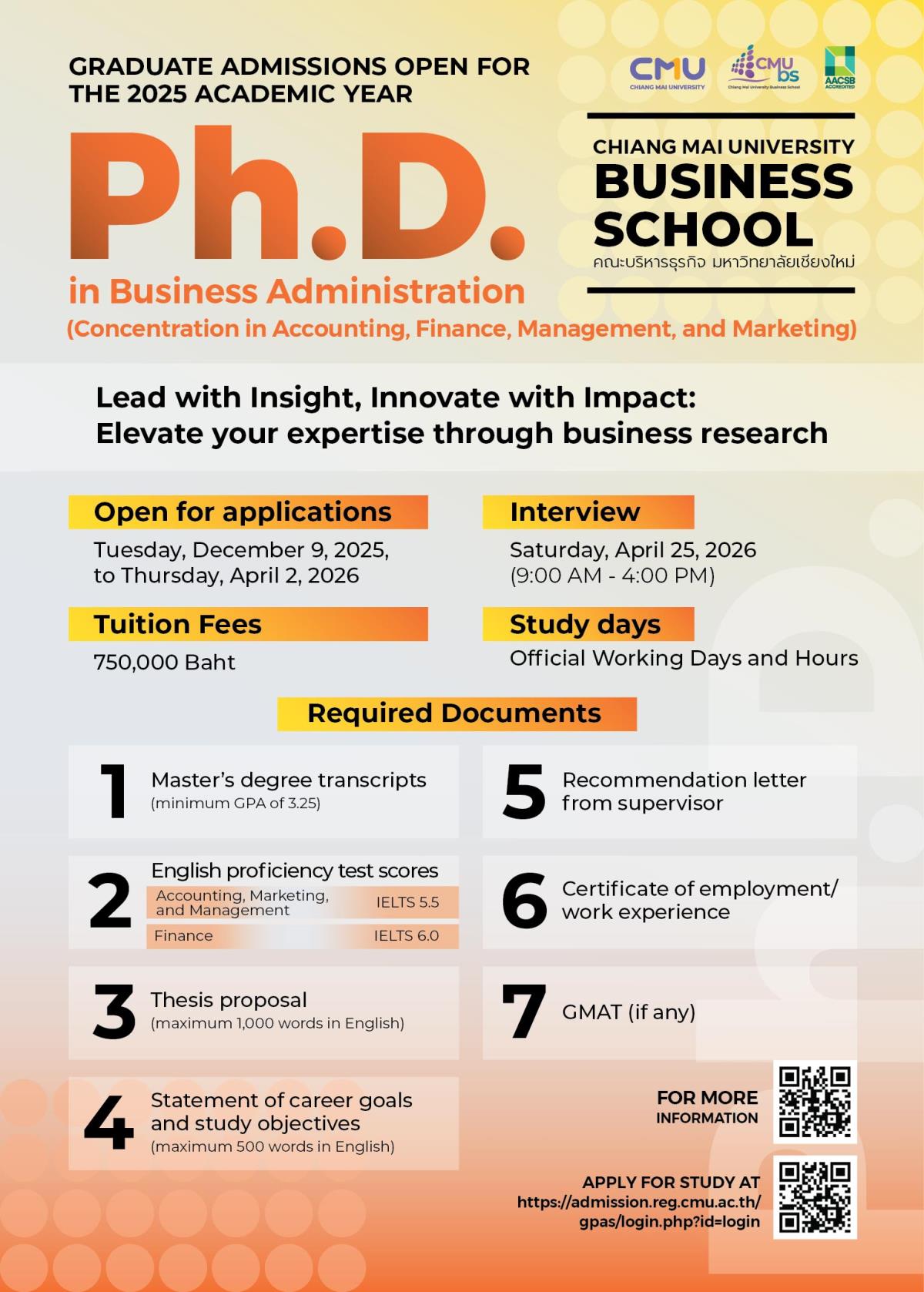 คณะบริหารธุรกิจ มหาวิทยาลัยเชียงใหม่ (CMUBS) ขอเชิญผู้สนใจพัฒนาศักยภาพทางธุรกิจและก้าวสู่อนาคตอย่างมั่นใจ สมัครเข้าศึกษาต่อในหลักสูตรระดับบัณฑิตศึกษา ประจำปีการศึกษา 2569 ครอบคลุมทั้งหลักสูตรปริญญาโท และปริญญาเอก ที่ออกแบบมาเพื่อตอบโจทย์โลกธุรกิจยุคใหม่
