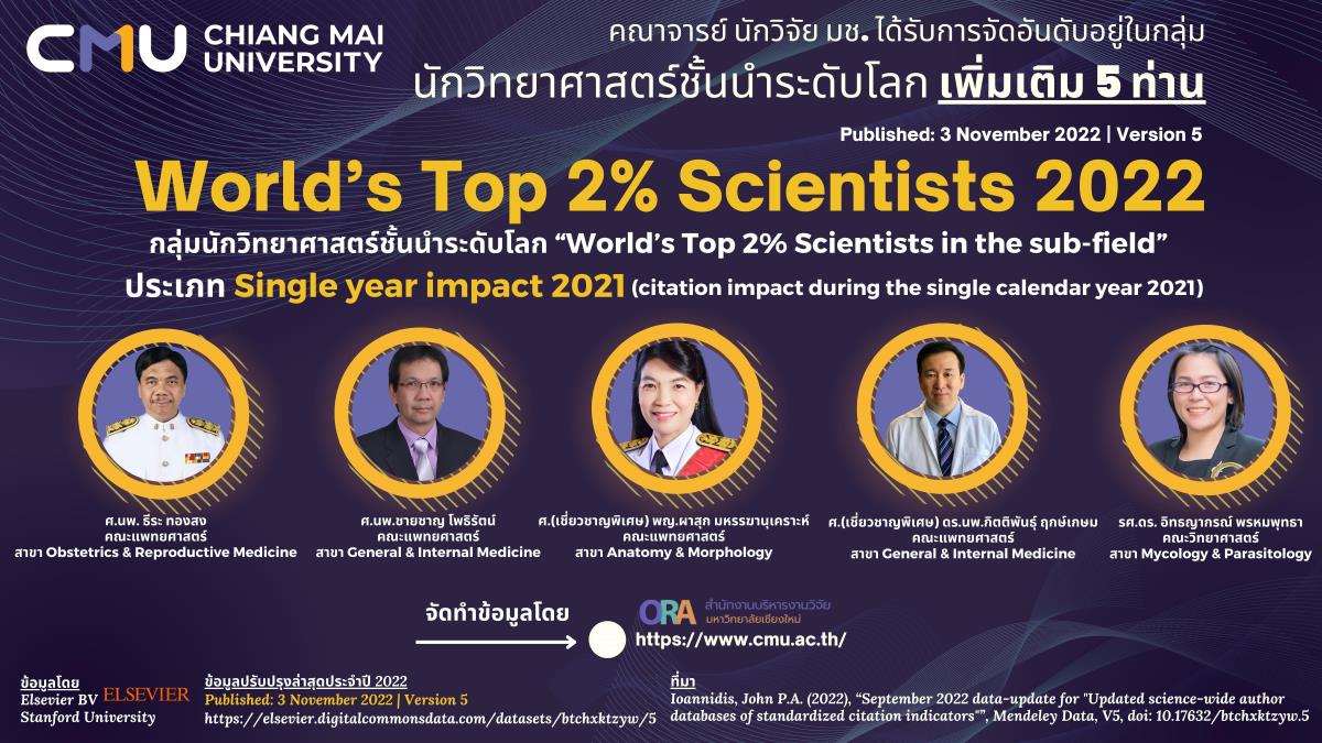 อาจารย์และนักวิจัย มช. ที่ ได้รับการจัดอันดับอยู่ในกลุ่มนักวิทยาศาสตร์ชั้นนำระดับโลกเพิ่มเติม 5 ท่าน “World’s Top 2% Scientists” ประจำปี 2022 โดย Stanford University