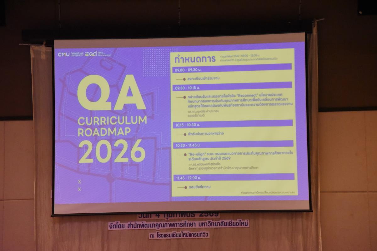 รองศาสตราจารย์ ภญ.อุษณีย์ คำประกอบ รองอธิการบดีมหาวิทยาลัยเชียงใหม่ เป็นประธานเปิดการประชุมสัมมนาในกิจกรรม QA Curriculum Roadmap 2026 และเป็นวิทยากรบรรยายในหัวข้อ “Reconnect”นโยบายประเทศกับบทบาทของการประกันคุณภาพการศึกษา เพื่อขับเคลื่อนการพัฒนาหลักสูตรให้สอดคล้องกับพันธกิจสถาบันและความต้องการ ตลาดแรงงาน ณ ห้องแกรนด์วิว 3 ศูนย์ประชุมนานาชาติเชียงใหม่แกรนด์วิว วันพฤหัสบดีที่ 4 กุมภาพันธ์ พ.ศ. 2569