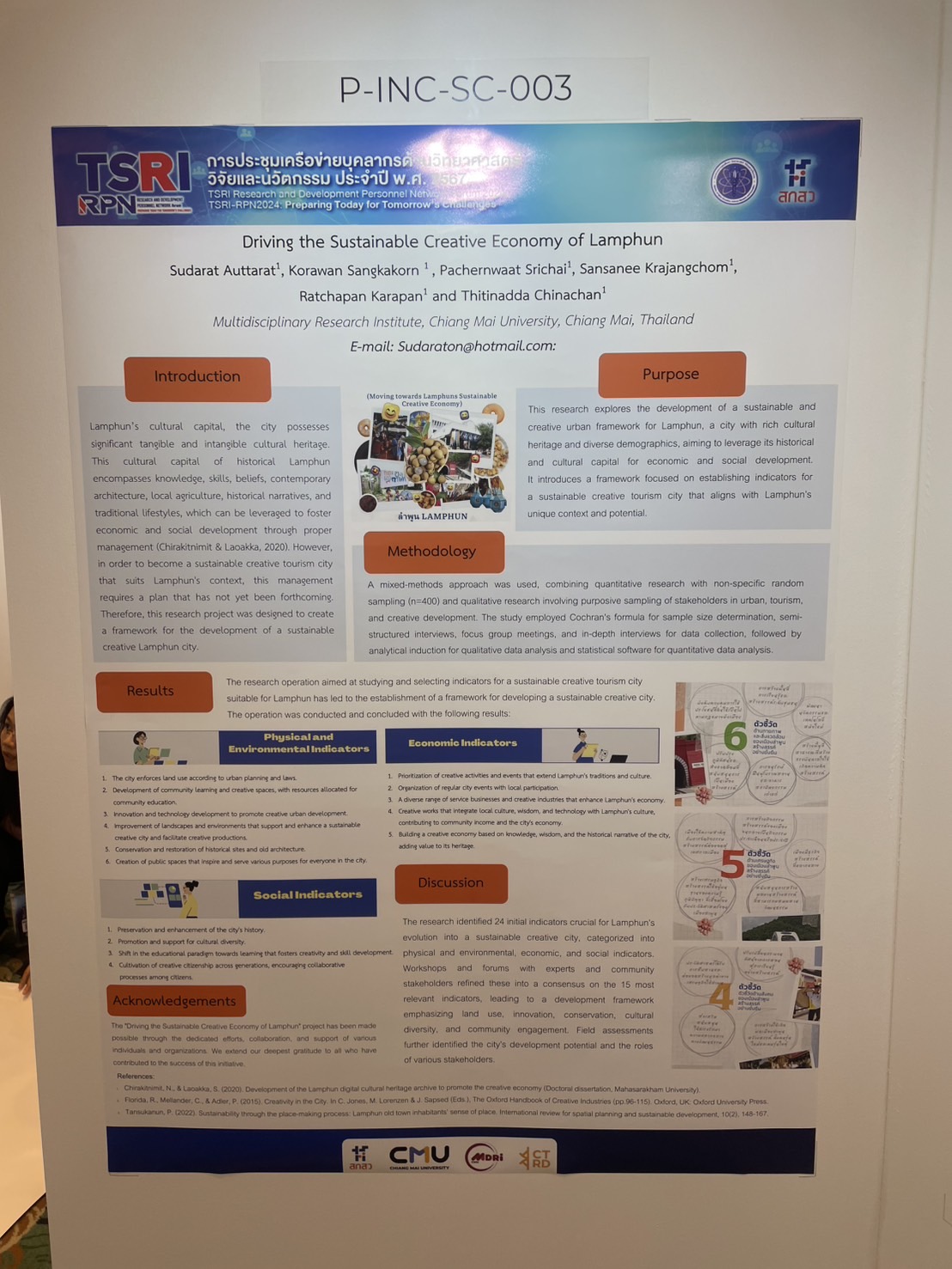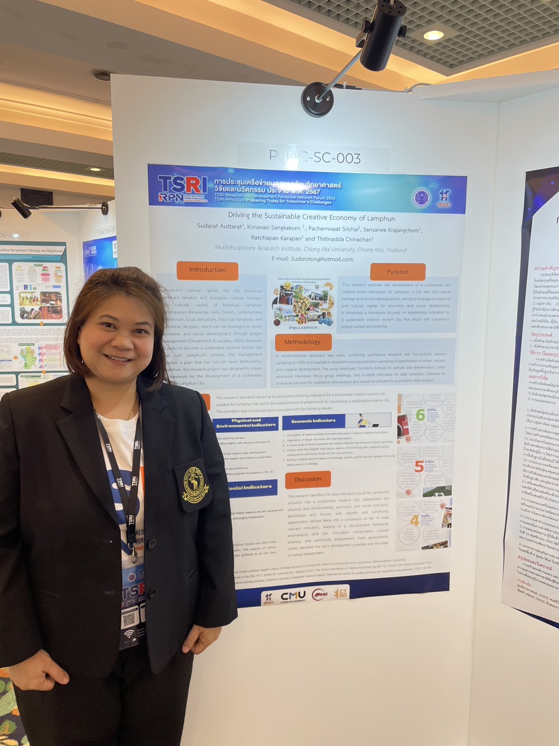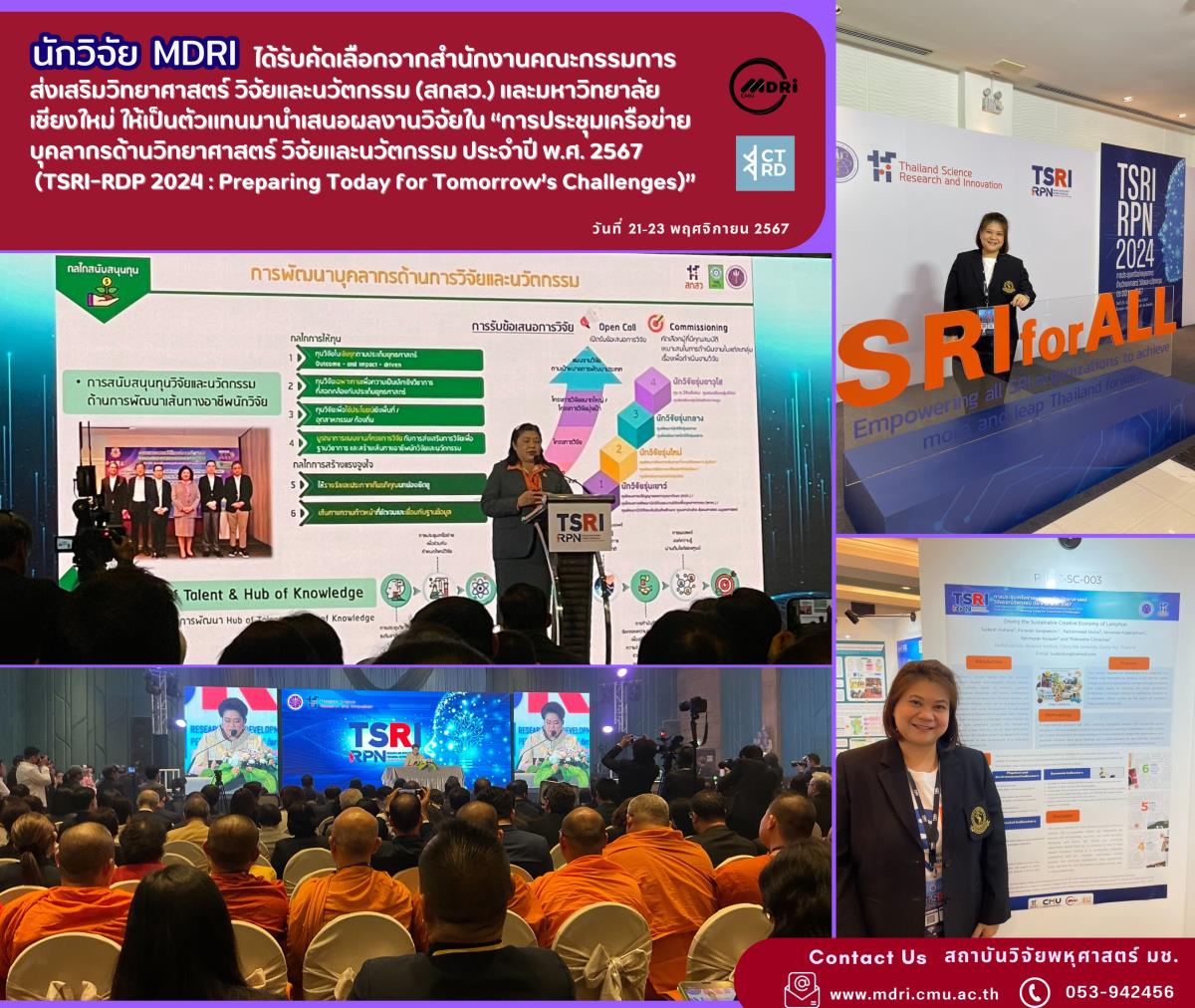 ดร.สุดารัตน์ อุทธารัตน์ นักวิจัย ชำนาญการพิเศษศูนย์วิจัยและพัฒนาการท่องเที่ยว มหาวิทยาลัยเชียงใหม่ ได้รับคัดเลือกจากสำนักงานคณะกรรมการส่งเสริมวิทยาศาสตร์ วิจัยและนวัตกรรม (สกสว.) และมหาวิทยาลัยเชียงใหม่ ให้เป็นตัวแทนมานำเสนอผลงานวิจัยใน “การประชุมเครือข่ายบุคลากรด้านวิทยาศาสตร์ วิจัยและนวัตกรรม ประจำปี พ.ศ. 2567 (TSRI-RDP 2024 : Preparing Today for Tomorrow’s Challenges)” ในระหว่างวันที่ 21 - 23 พฤศจิกายน พ.ศ. 2567 ณ โรงแรม เดอะ รีเจ้นท์ ชะอำ บีช รีสอร์ท จ.เพชรบุรี ในฐานะนักวิจัยรุ่นใหม่ของมหาวิทยาลัย