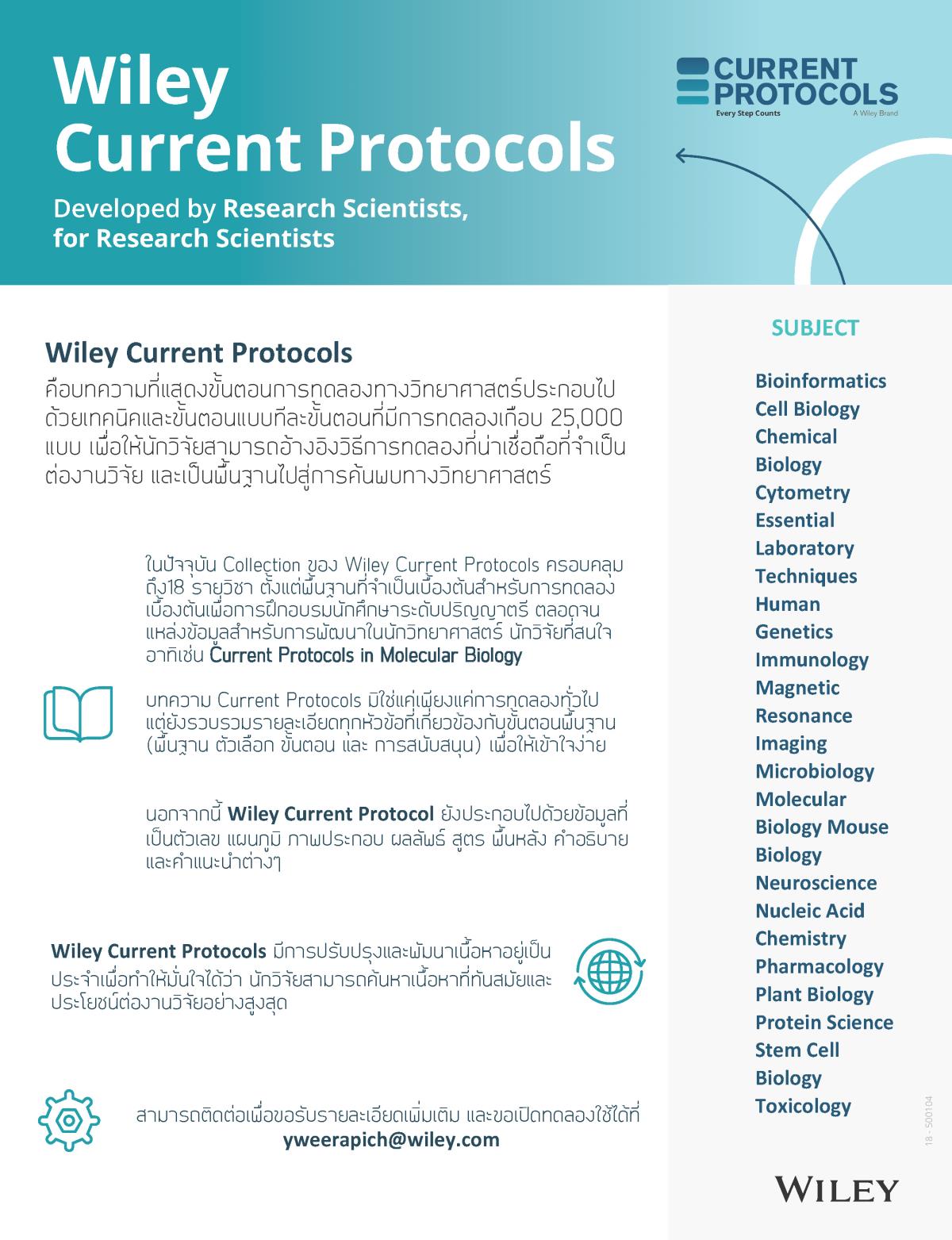 ฐานข้อมูล Wiley Current Protocol เป็นบทความที่แสดงขั้นตอนการทดลองทางวิทยาศาสตร์ ประกอบด้วยเทคนิคและขั้นตอนแบบทีละขั้นตอนที่มีการทดลองเกือบ 25,000 แบบ เพื่อให้นักวิจัยสามารถอ้างอิงวิธีการทดลองที่น่าเชื่อถือที่จำเป็นต่องานวิจัย และเป็นพื้นฐานไปสู่การค้นพบทางวิทยาศาสตร์