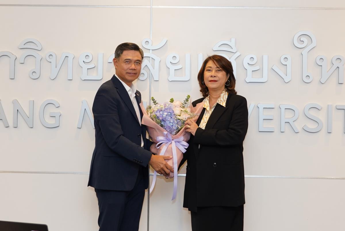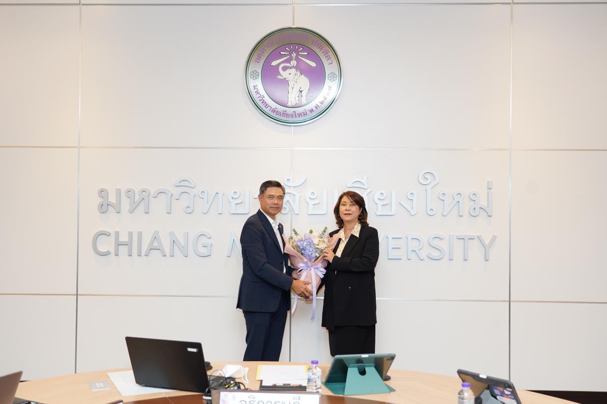 ศาสตราจารย์ ดร.นายแพทย์พงษ์รักษ์ ศรีบัณฑิตมงคล อธิการบดีมหาวิทยาลัยเชียงใหม่ มอบช่อดอกไม้แด่ รองศาสตราจารย์ ดร.เกียรติสุดา ศรีสุข คณบดีคณะศึกษาศาสตร์ เนื่องในโอกาสที่ดำรงตำแหน่งครบวาระการบริหารงาน ในการประชุมคณะกรรมการบริหารมหาวิทยาลัยเชียงใหม่ (กบม.) ครั้งที่ 16/2566 ณ ห้องประชุมตะวัน กังวานพงศ์ อาคารยุทธศาสตร์ สำนักงานมหาวิทยาลัย มหาวิทยาลัยเชียงใหม่ เมื่อวันพุธที่ 20 กันยายน พ.ศ. 2566