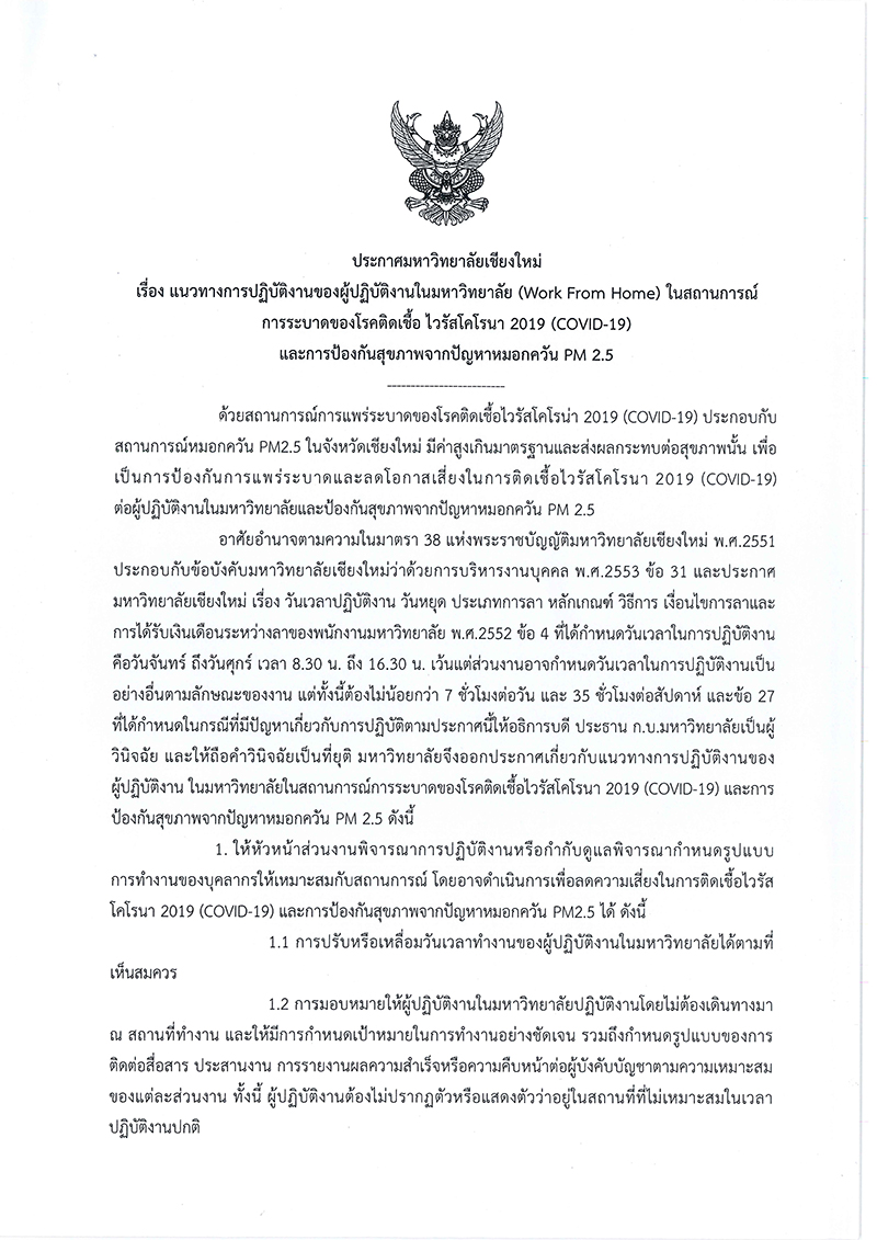 เรื่อง มาตรการปฏิบัติงานที่บ้านของผู้ปฏิบัติงานในมหาวิทยาลัยเชียงใหม่ (Work from Home)