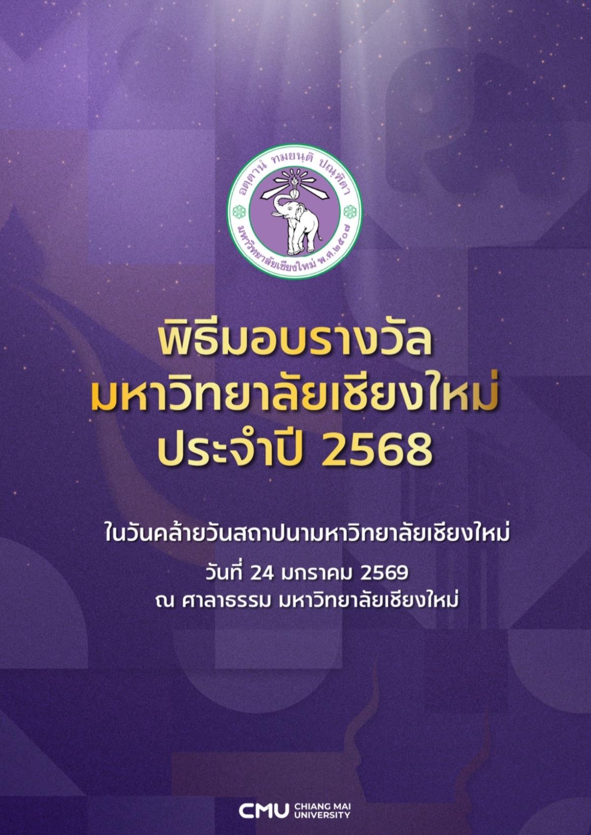 มช. จัดงานวันสถาปนามหาวิทยาลัย ครบรอบ 61 ปี พร้อมมอบรางวัลผู้บริหารดีเด่นจากกองทุนอธิการบดี รางวัลช้างทองคำ และโล่ประกาศเกียรติคุณศาสตราจารย์ วันเสาร์ที่ 24 ม.ค. 2569 ณ ศาลาธรรม .