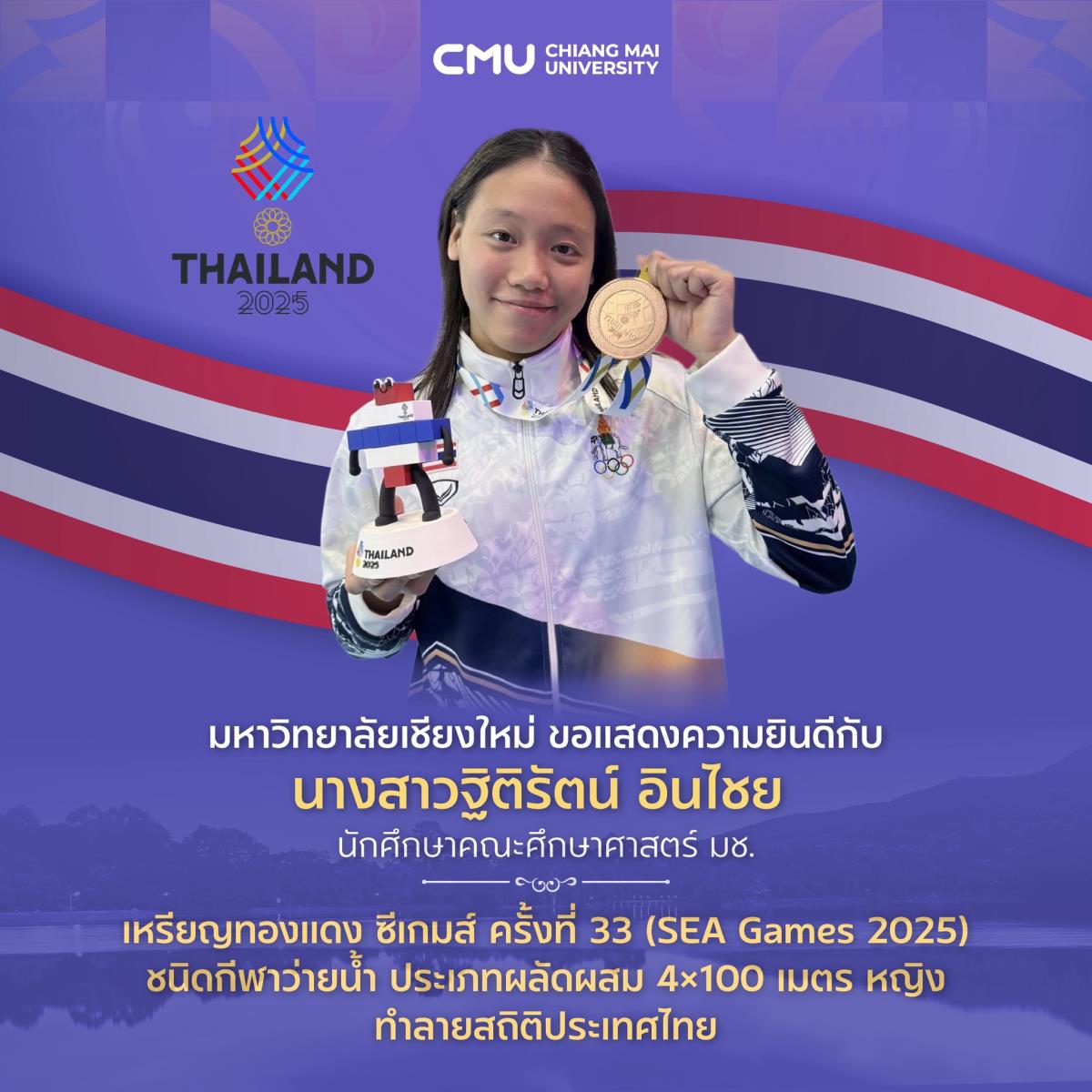 นักศึกษา มช. สร้างชื่อระดับอาเซียน! คว้าเหรียญทองแดง SEA Games 2025 ว่ายน้ำผลัดผสม พร้อมทุบสถิติประเทศไทย