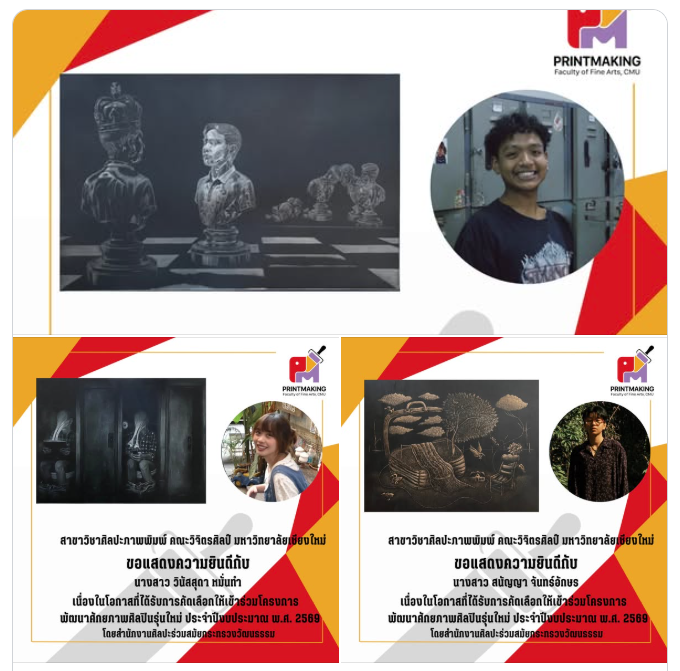 คณะวิจิตรศิลป์ มช. ขอแสดงความยินดีกับ นักศึกษาสาขาวิชาศิลปะภาพพิมพ์ ในโอกาสได้รับรางวัลโครงการพัฒนาศักยภาพศิลปินรุ่นใหม่ ประจำปีงบประมาณ พ.ศ. 2569 โดยสำนักงานศิลปะร่วมสมัยกระทรวงวัฒนธรรม