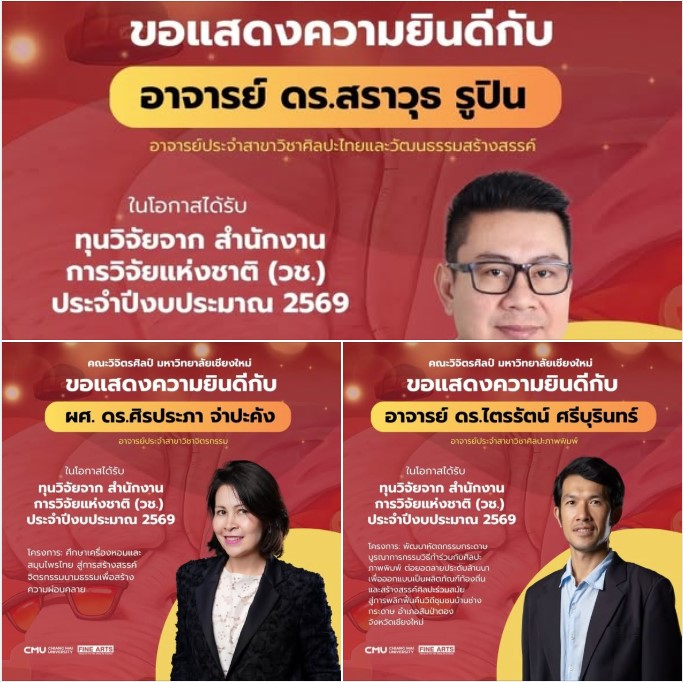 คณะวิจิตรศิลป์ มหาวิทยาลัยเชียงใหม่ ขอแสดงความยินดีกับอาจารย์ ในโอกาสได้รับทุนจาก สำนักงานการวิจัยแห่งชาติ (วช.) ประจำปีงบประมาณ 2569