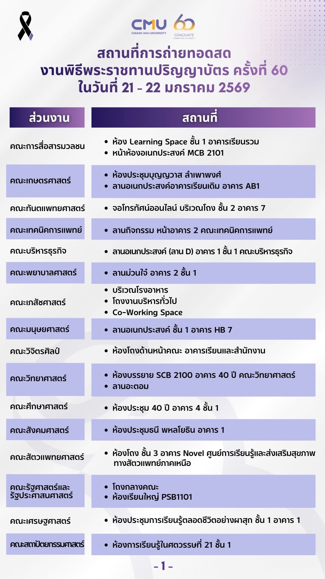 สมเด็จพระกนิษฐาธิราชเจ้า กรมสมเด็จพระเทพรัตนราชสุดาฯ สยามบรมราชกุมารี เสด็จพระราชดำเนินพระราชทานปริญญาบัตร แก่บัณฑิตมหาวิทยาลัยเชียงใหม่ ครั้งที่ 60 วันที่ 21-22 มกราคม 2569 ณ หอประชุม มช