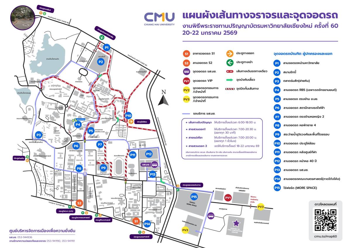 แผนผังเส้นทางจราจรและจุดจอดรถ งานพิธีพระราชทานปริญญาบัตร มหาวิทยาลัยเชียงใหม่ ครั้งที่ 60 ระหว่างวันที่ 20-22 มกราคม 2569