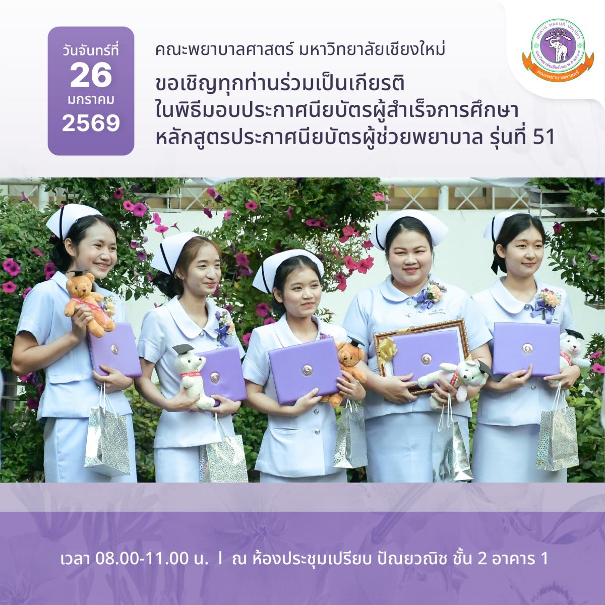 ขอเชิญทุกท่านร่วมเป็นเกียรติในพิธีมอบประกาศนียบัตรผู้สำเร็จการศึกษาหลักสูตรประกาศนียบัตรผู้ช่วยพยาบาล (รุ่นที่ 51)