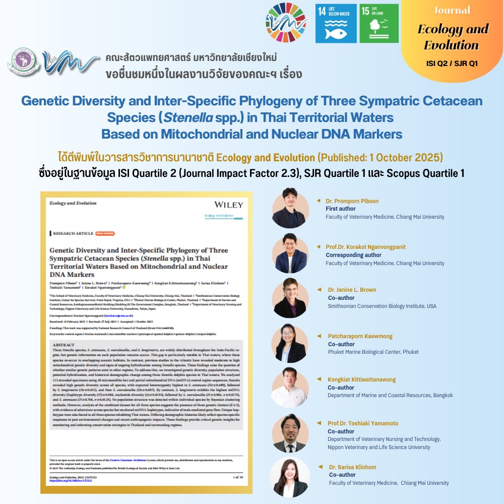 ผลงานวิจัยจากคณะสัตวแพทยศาสตร์ มหาวิทยาลัยเชียงใหม่ เรื่อง Genetic Diversity and Inter-Specific Phylogeny of Three Sympatric Cetacean Species (Stenella spp.) in Thai Territorial Waters Based on Mitochondrial and Nuclear DNA Markers ได้ตีพิมพ์ในวารสารวิชาการนานาชาติ Ecology and Evolution (Published: 1 October 2025)