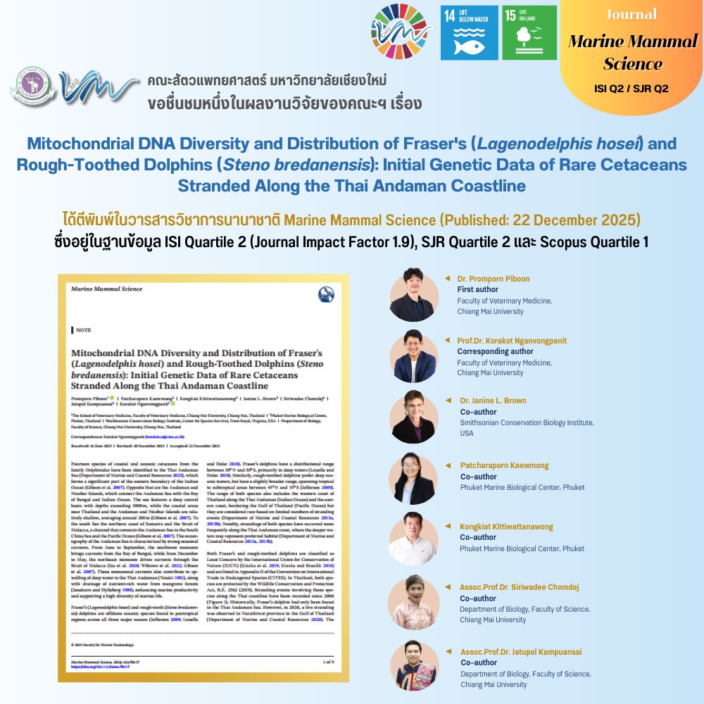 ผลงานวิจัยจากคณะสัตวแพทยศาสตร์ มหาวิทยาลัยเชียงใหม่ เรื่อง Mitochondrial DNA Diversity and Distribution of Fraser's (Lagenodelphis hosei) and Rough-Toothed Dolphins (Steno bredanensis): Initial Genetic Data of Rare Cetaceans Stranded Along the Thai Andaman Coastline ได้ตีพิมพ์ในวารสารวิชาการนานาชาติ Marine Mammal Science (Published: 22 December 2025)