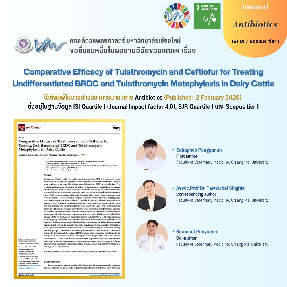 ผลงานวิจัยจากคณะสัตวแพทยศาสตร์ มหาวิทยาลัยเชียงใหม่ เรื่อง Comparative Efficacy of Tulathromycin and Ceftiofur for Treating Undifferentiated BRDC and Tulathromycin Metaphylaxis in Dairy Cattle ได้ตีพิมพ์ในวารสารวิชาการนานาชาติ Antibiotics (Published: 2 February 2026)