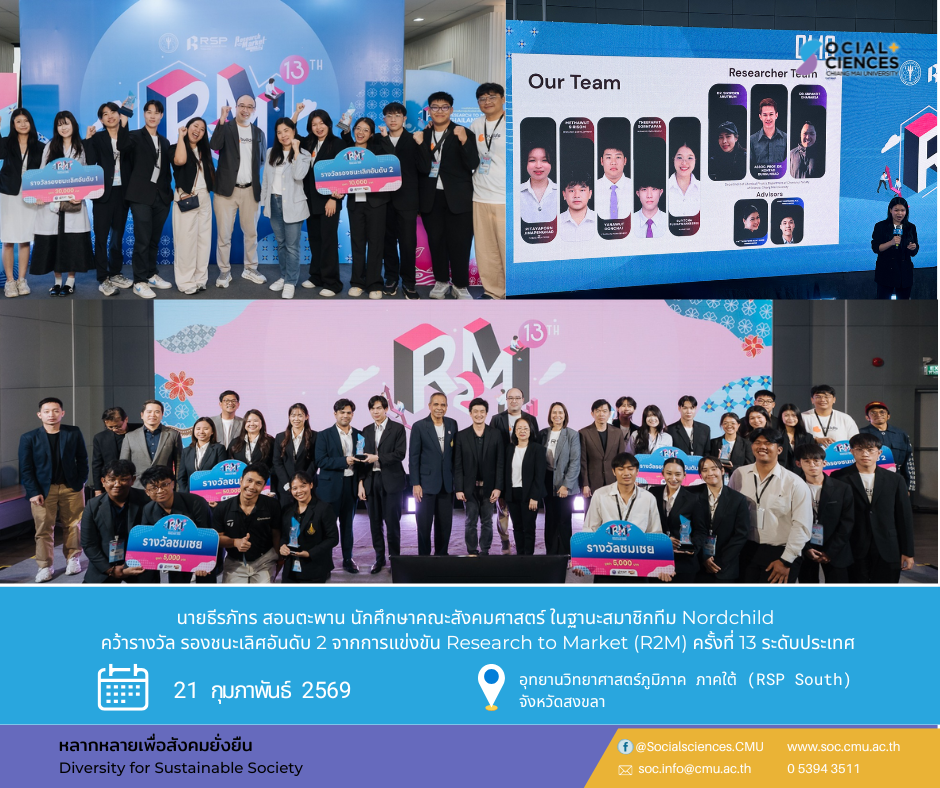 นักศึกษาคณะสังคมศาสตร์ ในฐานะสมาชิกทีม Nordchild ที่คว้ารางวัล รองชนะเลิศอันดับ 2 จากการแข่งขัน Research to Market (R2M) ครั้งที่ 13 ระดับประเทศ