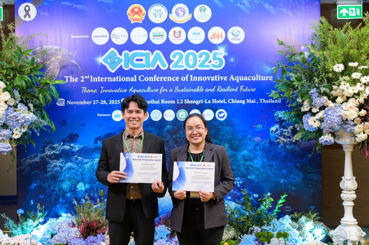 ขอแสดงความยินดีกับ อ. ดร. น.สพ. ทรงพล พุทธศิริ และ สพ.ญ. สราลี ศรีวรกุล จากคณะสัตวแพทยศาสตร์ มช. ที่ได้รับรางวัล ในงานประชุม The 2nd International Conference of Innovative Aquaculture (ICIA 2025) Theme: Innovative Aquaculture for a Sustainable and Resilient Future จัดโดยภาควิชาสัตวศาสตร์และสัตว์น้ำ คณะเกษตรศาสตร์ มหาวิทยาลัยเชียงใหม่ ระหว่างวันที่ 27-28 พฤศจิกายน 2568 ณ โรงแรมแชงกรี-ลา เชียงใหม่