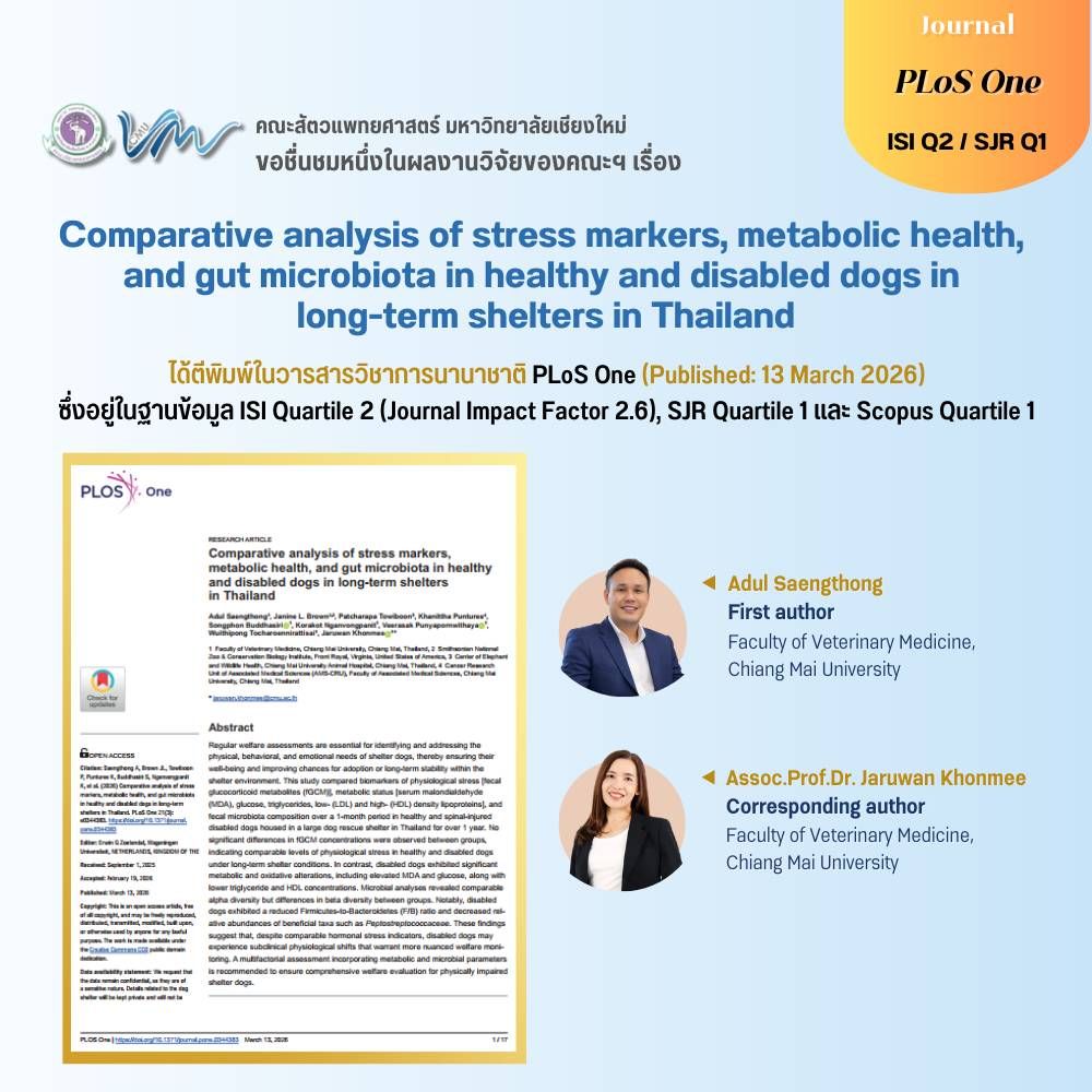 ผลงานวิจัยจากคณะสัตวแพทยศาสตร์ มหาวิทยาลัยเชียงใหม่ เรื่อง Comparative analysis of stress markers, metabolic health, and gut microbiota in healthy and disabled dogs in long-term shelters in Thailand ได้ตีพิมพ์ในวารสารวิชาการนานาชาติ PLoS One (Published: 13 March 2026)