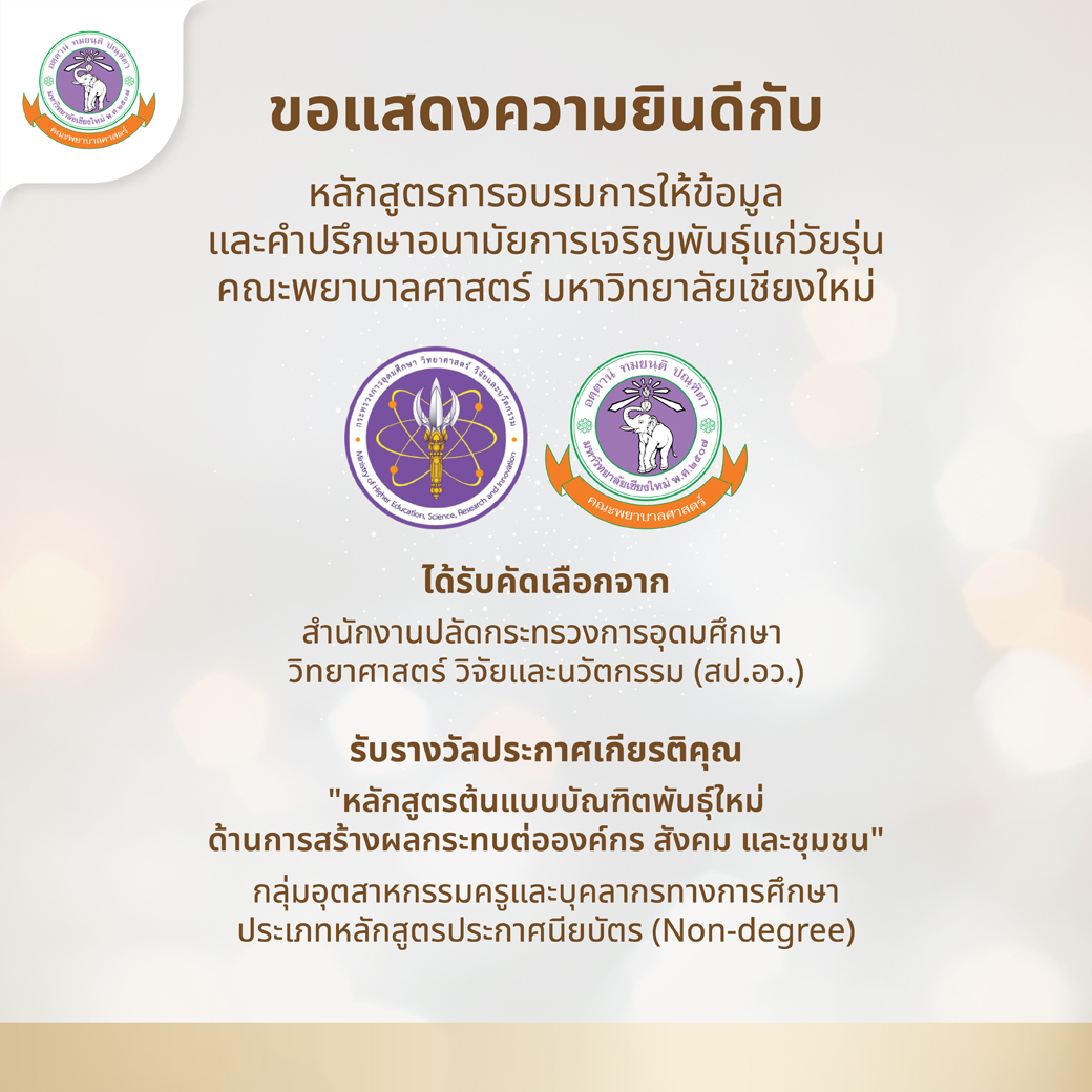 คณะพยาบาลศาสตร์ มหาวิทยาลัยเชียงใหม่ เป็นสถาบันการศึกษาพยาบาลชั้นนำระดับสากลเพื่อสร้างสุขภาวะที่ยั่งยืน เป้าหมายวิสัยทัศน์ ในปี 2571 | QS Ranking by subject 50 อันดับแรกของโลก | Socio-economic impact 300 ล้านบาท | TQC+ (operation)
