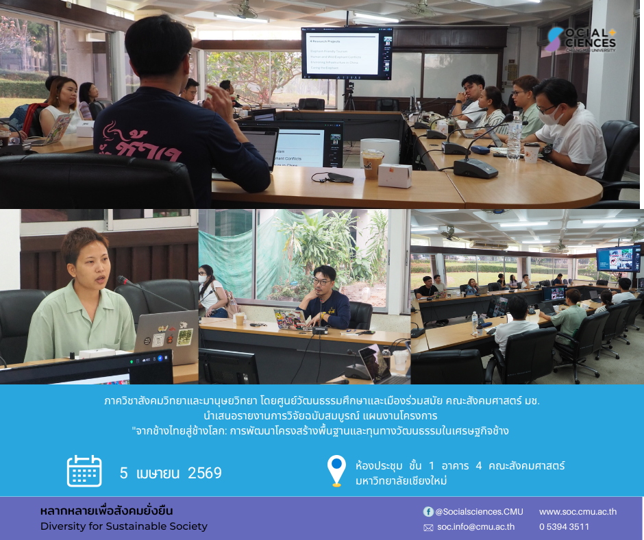 คณะสังคมศาสตร์ มช. การนำเสนอรายงานการวิจัยฉบับสมบูรณ์ แผนงานโครงการ "จากช้างไทยสู่ช้างโลก: การพัฒนาโครงสร้างพื้นฐานและทุนทางวัฒนธรรมในเศรษฐกิจช้าง (Globalizing Thai Elephants: Developing Infrastructure and Cultural C apital in the Elephant Economy)" คณะสังคมศาสตร์