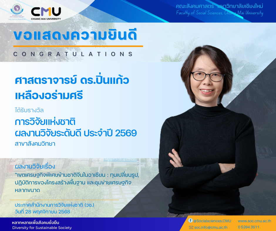 อาจารย์คณะสังคมศาสตร์ ได้รับ รางวัลการวิจัยแห่งชาติ ผลงานวิจัยระดับดี ประจำปีงบประมาณ 2569 คณะสังคมศาสตร์