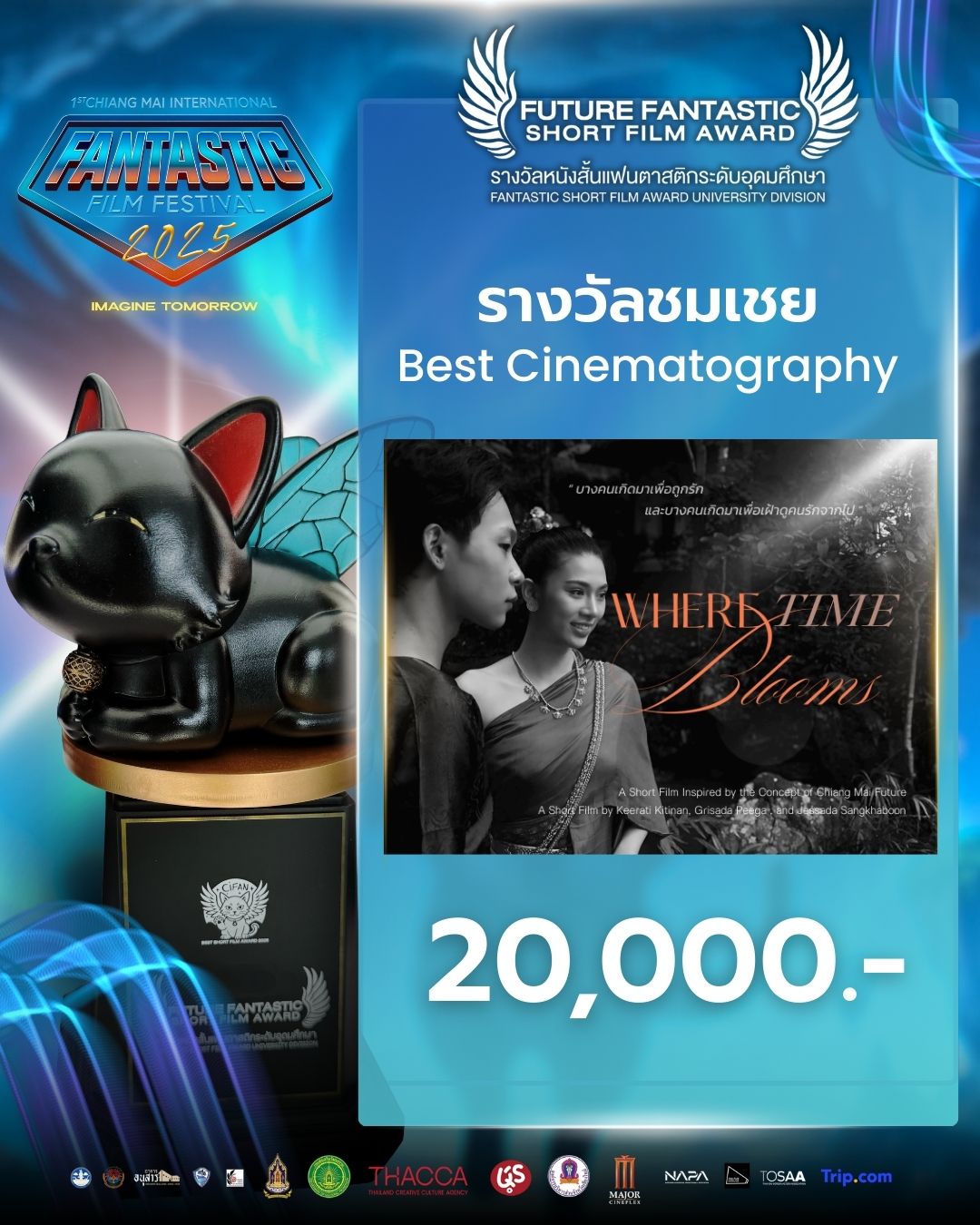 นักศึกษาคณะการสื่อสารมวลชน มหาวิทยาลัยเชียงใหม่ สร้างชื่อเสียงให้คณะและมหาวิทยาลัยอย่างต่อเนื่อง คว้า “รางวัลชมเชย Best Cinematography ในสาขา Future Fantastic Short Film Competitions” พร้อมรับเงินรางวัล 20,000 บาท จากเวทีการประกวด CIFAN Short Competition 2025 ภายในงาน Chiang Mai International Fantastic Film Festival 2025 (เทศกาลภาพยนตร์แฟนตาสติกนานาชาติเชียงใหม่) ซึ่งจัดขึ้น ณ สวนสาธารณะรถไฟเชียงใหม่ เมื่อวันศุกร์ที่ 27 สิงหาคม 2568 เวลา 18.00 – 21.00 น.