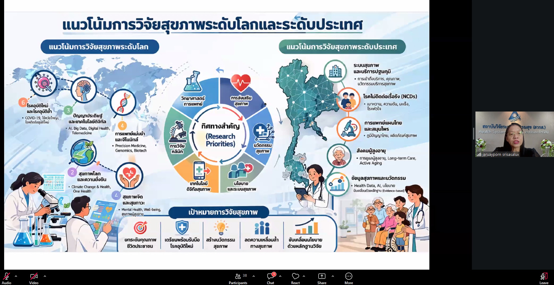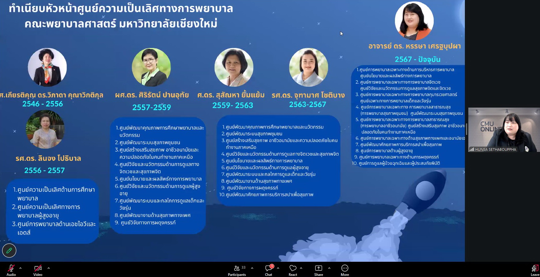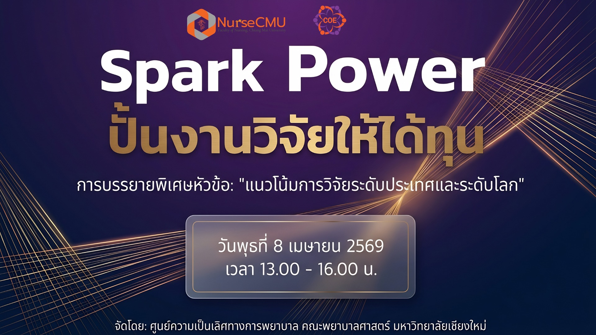 ศูนย์ความเป็นเลิศทางการพยาบาล คณะพยาบาลศาสตร์ มหาวิทยาลัยเชียงใหม่ จัดการบรรยายพิเศษ เรื่อง "แนวโน้มการวิจัยระดับประเทศและระดับโลก" ภายใต้โครงการ Spark Power ปั้นงานวิจัยให้ได้ทุน โดยมี อาจารย์ ดร.หรรษา เศรษฐบุปผา หัวหน้าศูนย์ความเป็นเลิศทางการพยาบาล เป็นประธานกล่าวเปิดงาน วิทยากรผู้ทรงคุณวุฒิได้รับเกียรติจาก ผู้ช่วยศาสตราจารย์ ดร.จรวยพร ศรีศศลักษณ์ รองผู้อำนวยการสถาบันวิจัยระบบสาธารณสุข (สวรส.) วัตถุประสงค์เพื่อสร้างความเข้าใจเกี่ยวกับภาพรวมการสนับสนุนทุนวิจัยตลอดจนยุทธศาสตร์ชาติและระดับโลกพร้อมทั้งเรียนรู้เทคนิคจากกรณีศึกษา สำหรับนำมาปรับใช้ในการเขียนขอทุนวิจัยเพื่อสร้างสรรค์ผลงานคุณภาพที่มีผลกระทบสูง (High Impact) กิจกรรมดังกล่าวจัดขึ้นผ่านระบบ Zoom เมื่อวันพุธที่ 8 เมษายน 2569