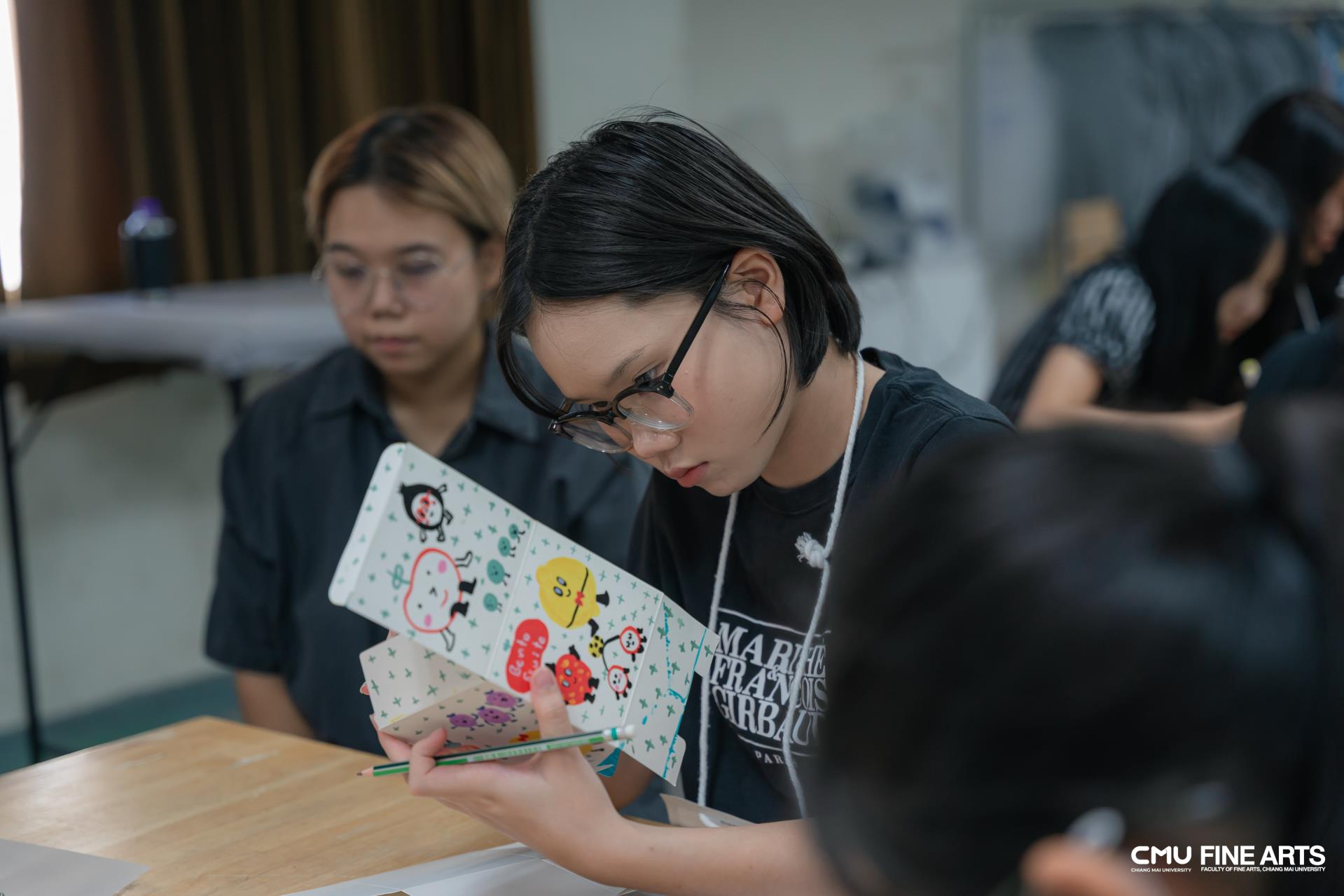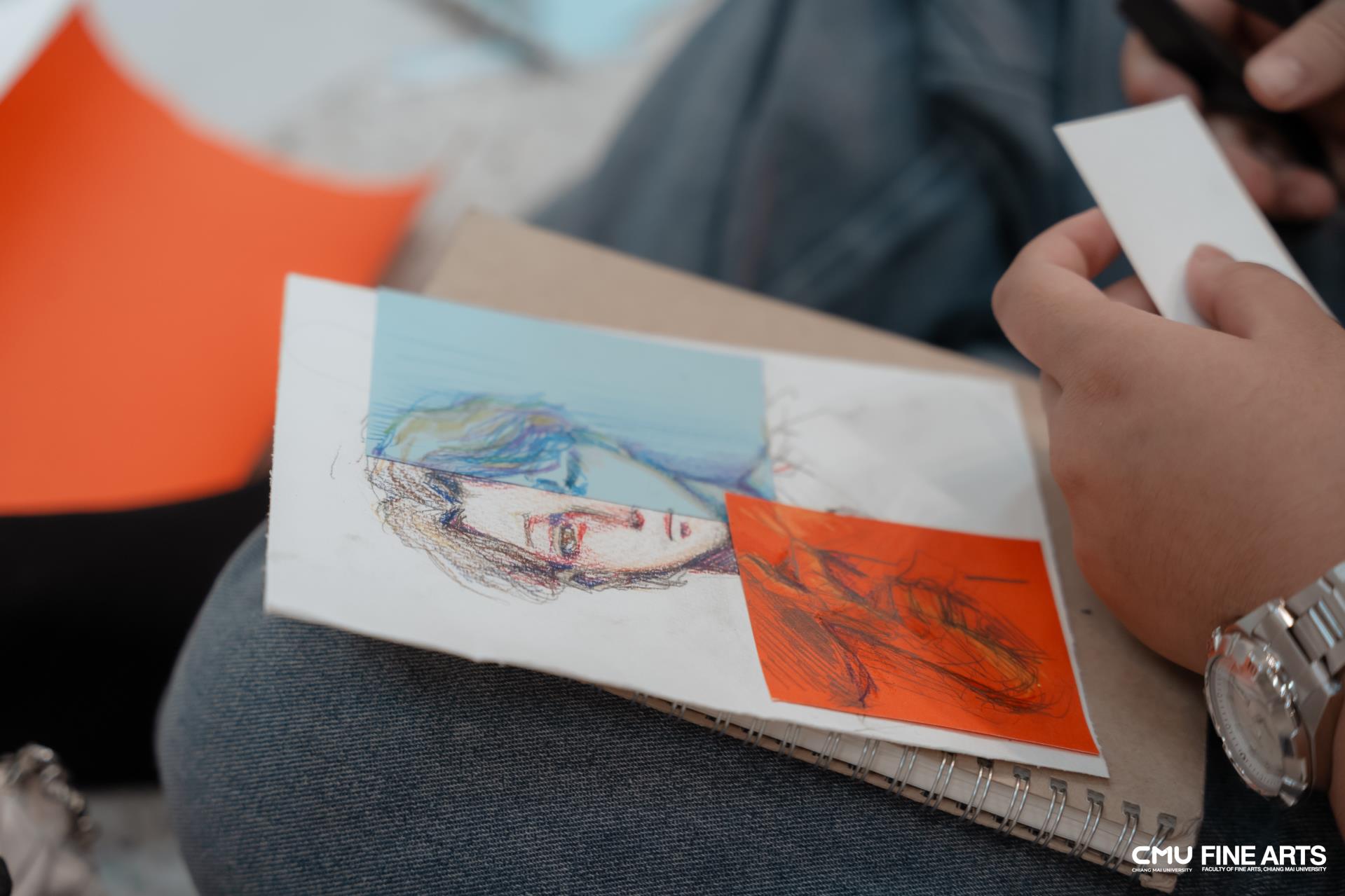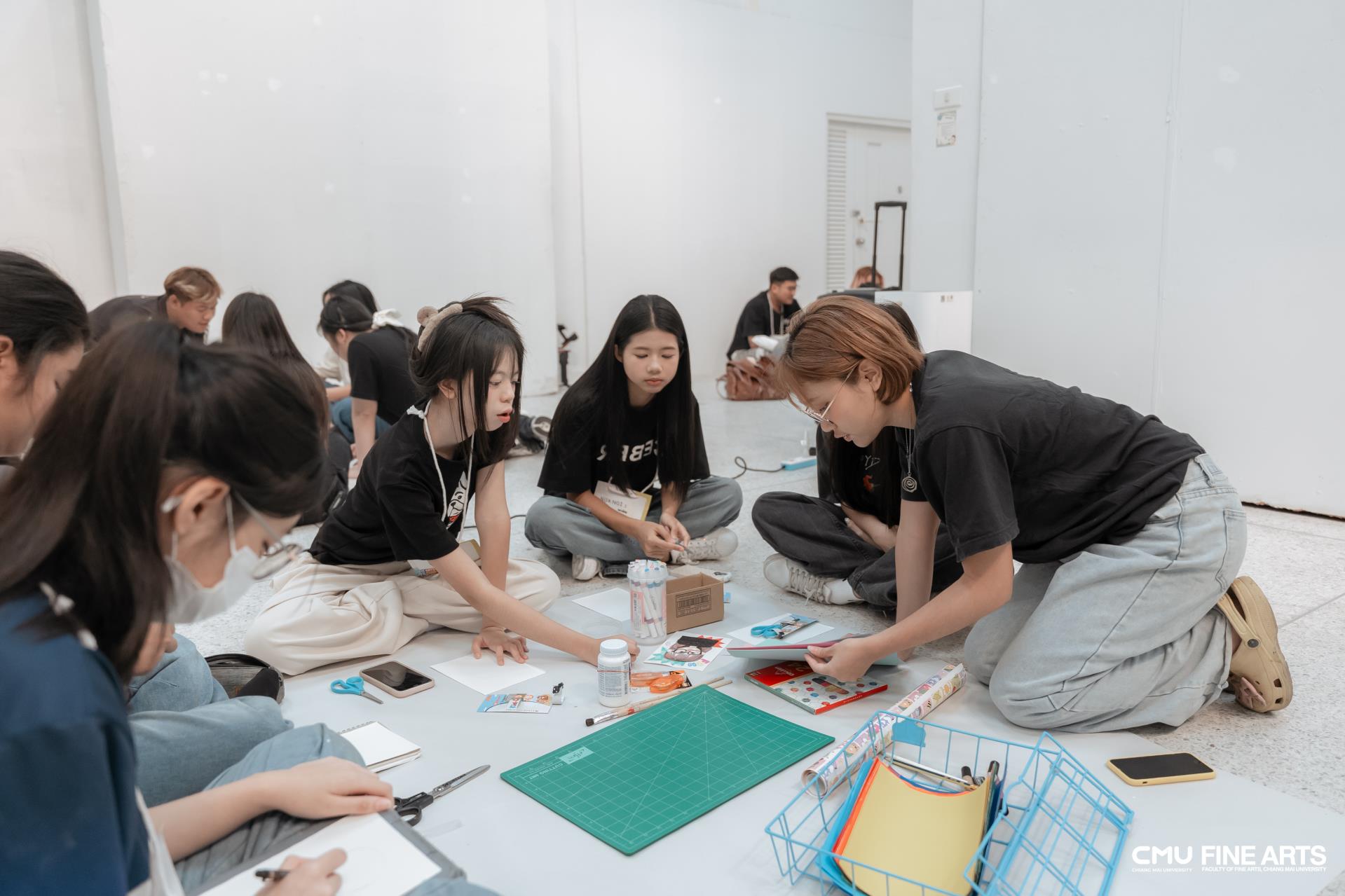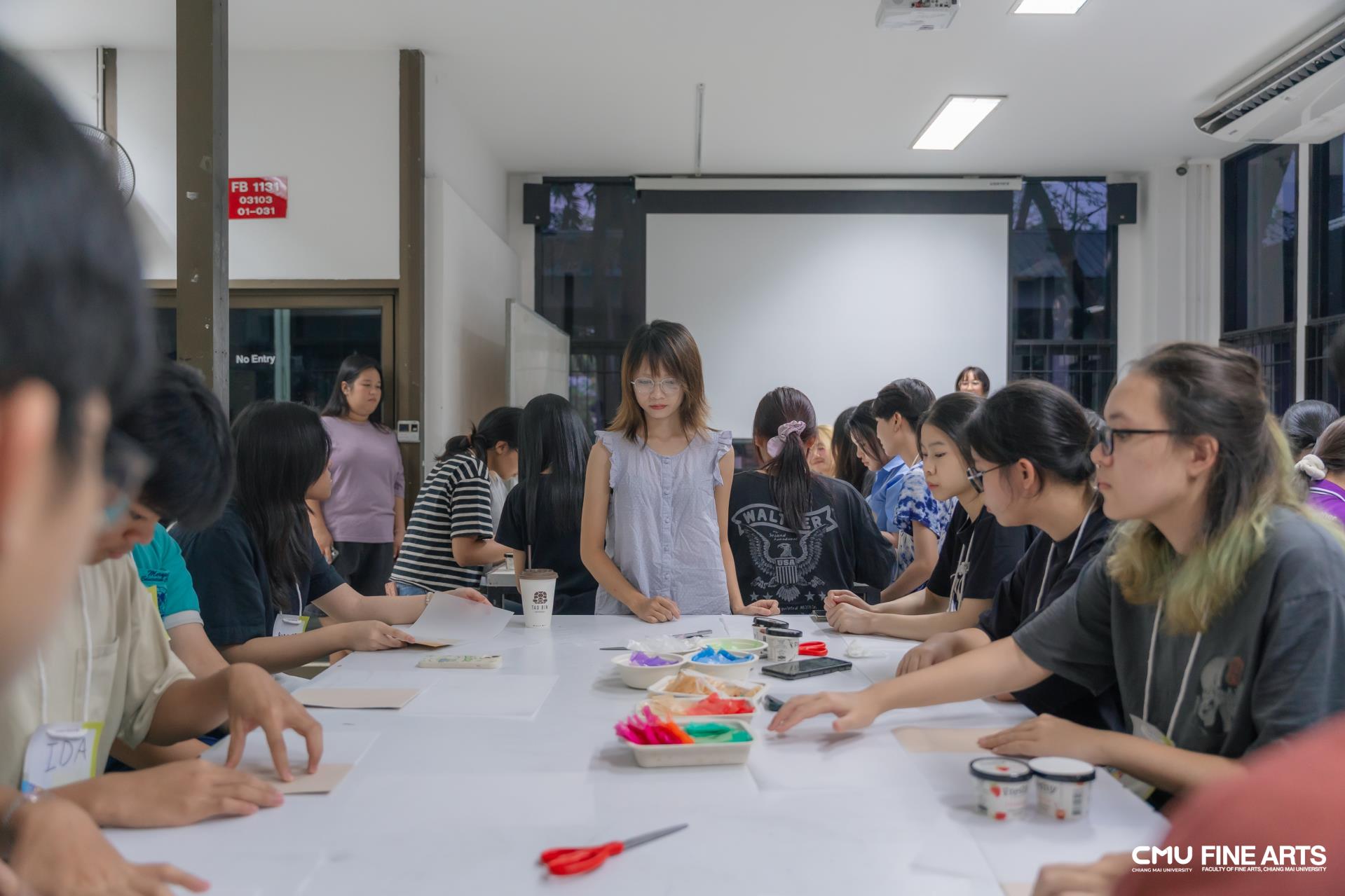 วันที่สอง (8 เมษายน 2569) ผู้เข้าร่วมได้พัฒนาทักษะอย่างต่อเนื่องผ่านกิจกรรม Workshop จากหลากหลายสาขาวิชา อาทิ Paper Cut Self-Portrait จากสาขาจิตรกรรม การเรียนรู้ลวดลายไทยในกิจกรรม “ต่อลายครู” จากสาขาศิลปะไทยและวัฒนธรรมสร้างสรรค์ และการปั้นงานสามมิติในกิจกรรม Claytime Cuties จากสาขาประติมากรรม