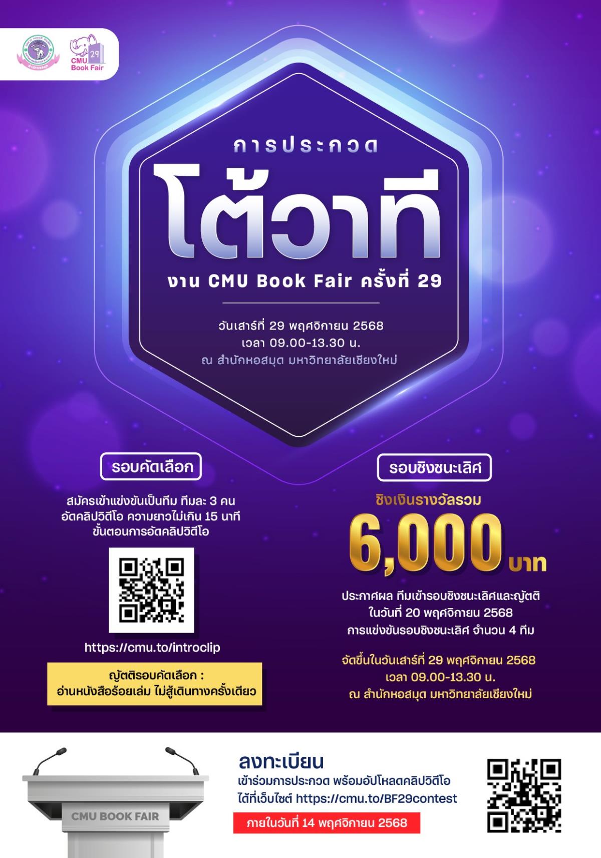 กิจกรรมส่งเสริมการเรียนรู้ กิจกรรมประกวดโต้วาที ระดับชั้นมัธยมศึกษาตอนปลาย ในวันเสาร์ที่ 29 พฤศจิกายน 2568 เวลา 9.00 – 12.00 น. เป็นต้นไป ชิงเงินรางวัลรวม 6,000 บาท ลงทะเบียนได้ที่ https://cmu.to/BF29contest