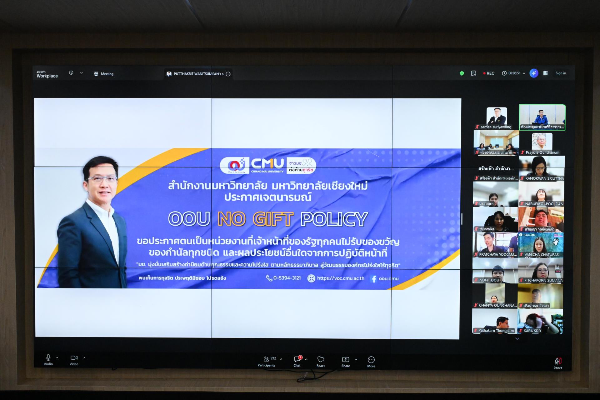 นายชัชพล กุลโพธิสุวรรณ ผู้อำนวยการสำนักงานมหาวิทยาลัย มหาวิทยาลัยเชียงใหม่ นำคณะผู้บริหารของสำนักงานมหาวิทยาลัยและบุคลากร ประกาศเจตนารมณ์การเป็นหน่วยงานที่ผู้บริหารและผู้ปฏิบัติงานของมหาวิทยาลัยเชียงใหม่ทุกคน ไม่รับของขวัญ ของกำนัล และผลประโยชน์อื่นใดทุกชนิด ทั้งในขณะ ก่อน และหลังปฏิบัติหน้าที่ อันจะส่งผลให้เกิดการทุจริตและประพฤติมิชอบ (No Gift Policy) ประจำปีงบประมาณ พ.ศ. 2569 และการประชุมชี้แจงมาตรการประหยัดพลังงานเพื่อความยั่งยืน ตลอดจนแนวทางการปฏิบัติงานนอกสถานที่ตั้ง ณ ห้องประชุมพระยาศรีวิสารวาจา อาคารสำนักงานมหาวิทยาลัย 1 มหาวิทยาลัยเชียงใหม่ วันอังคารที่ 31 มีนาคม พ.ศ. 2569