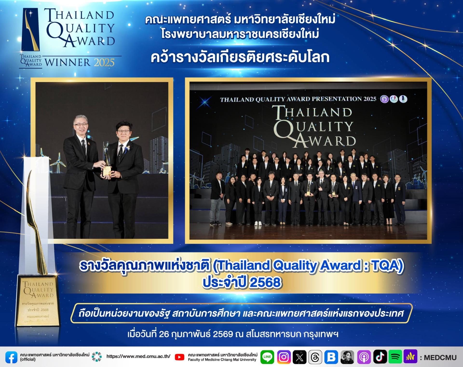 คณะแพทยศาสตร์ มช. โรงพยาบาลมหาราชนครเชียงใหม่ คว้ารางวัลเกียรติยศระดับโลก รางวัลคุณภาพแห่งชาติ (Thailand Quality Award : TQA) ประจำปี 2568