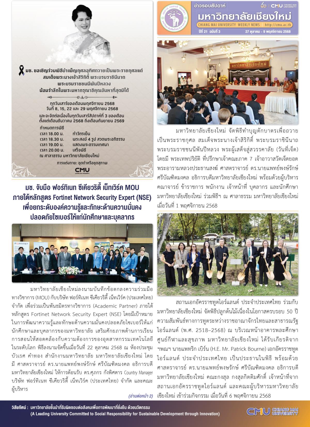 มหาวิทยาลัยเชียงใหม่มุ่งสร้างองค์ความรู้และนวัตกรรมที่ทันสมัย พร้อมพัฒนากำลังคนคุณภาพสูง เพื่อตอบโจทย์การเปลี่ยนแปลงของโลก และขับเคลื่อนสังคมสู่อนาคตที่ยั่งยืนด้วยวิทยาการและภูมิปัญญาที่ผสมผสานระหว่างเทคโนโลยีล้ำสมัยกับรากฐานทางวัฒนธรรมที่เข้มแข็ง